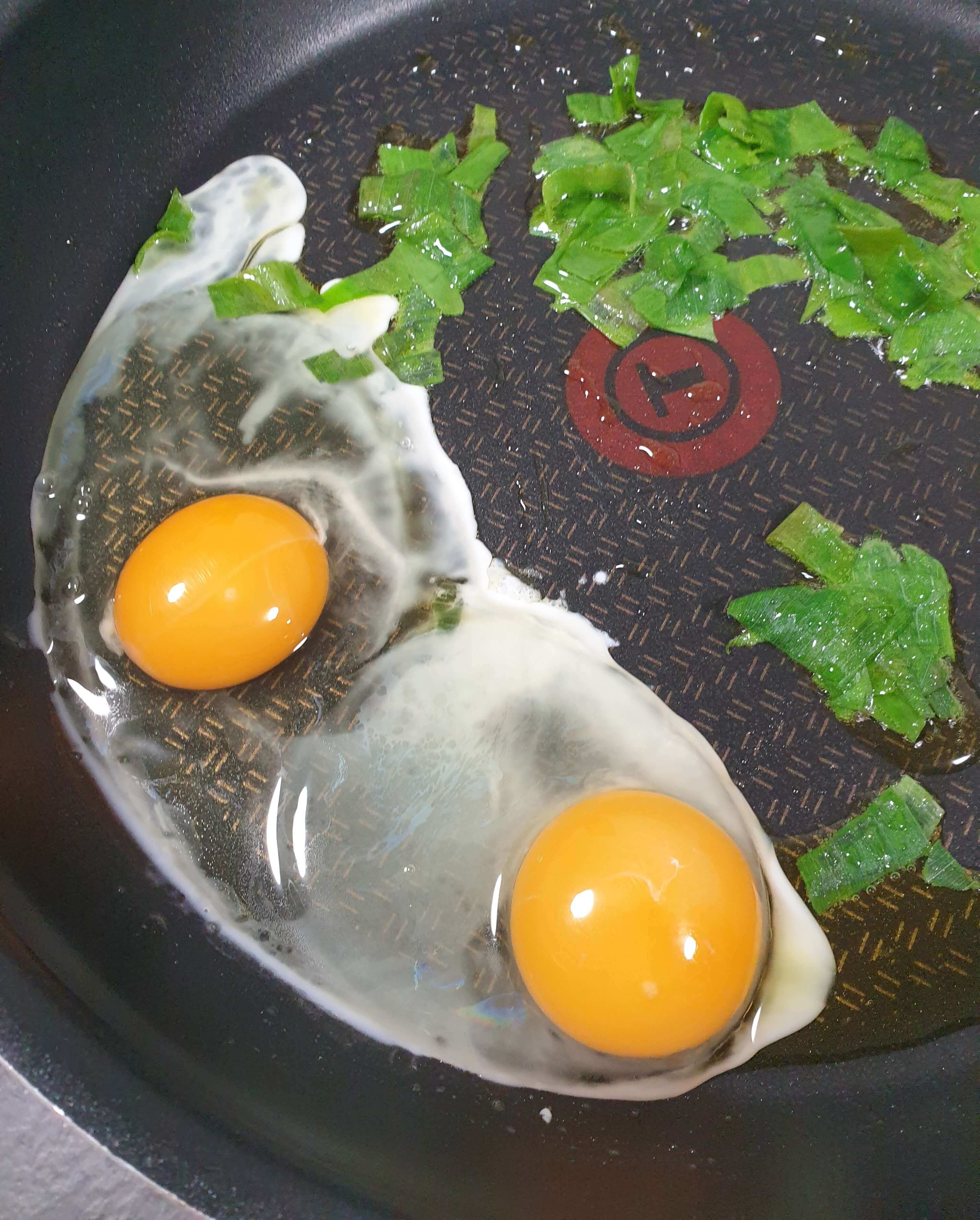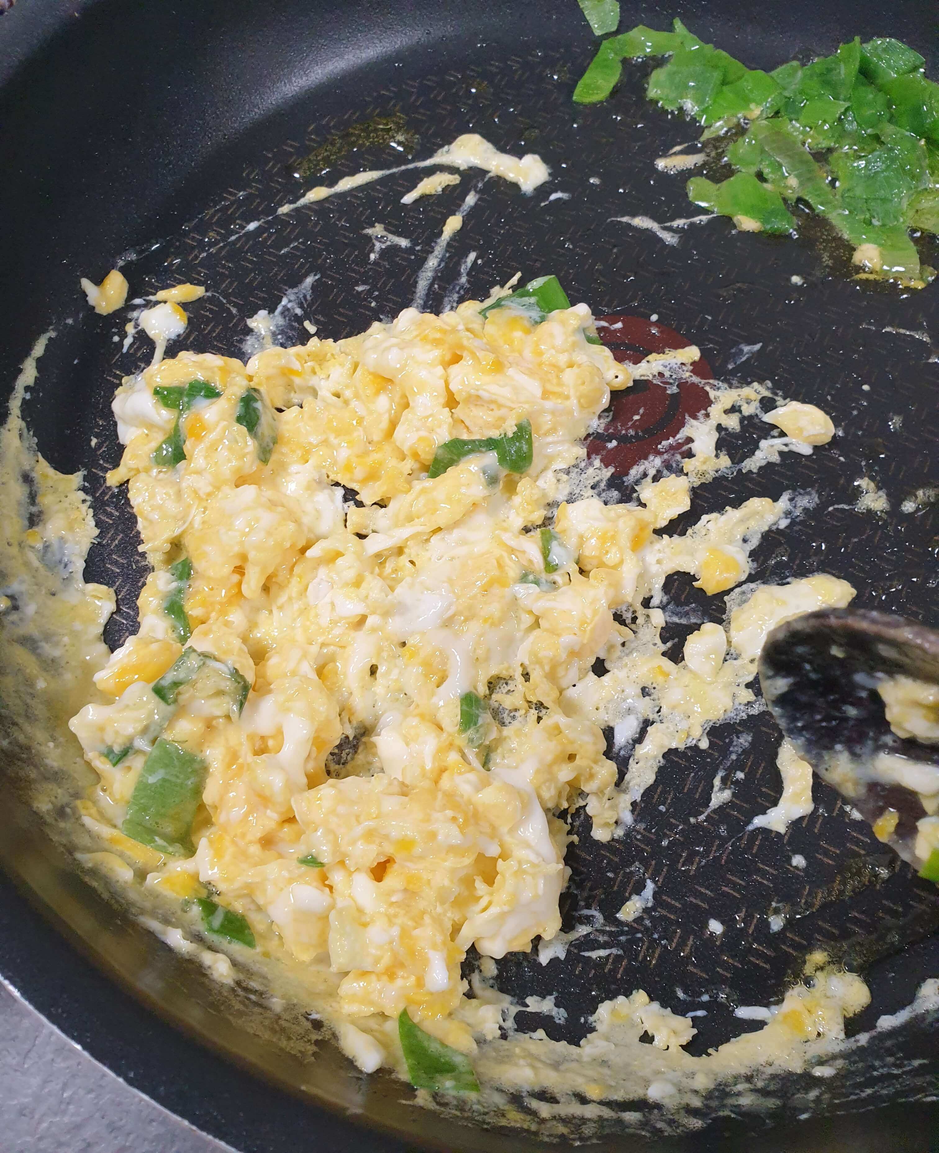한쪽에서 계란 2개를 스크램블 해 주세요.