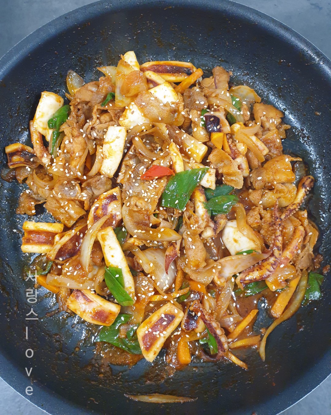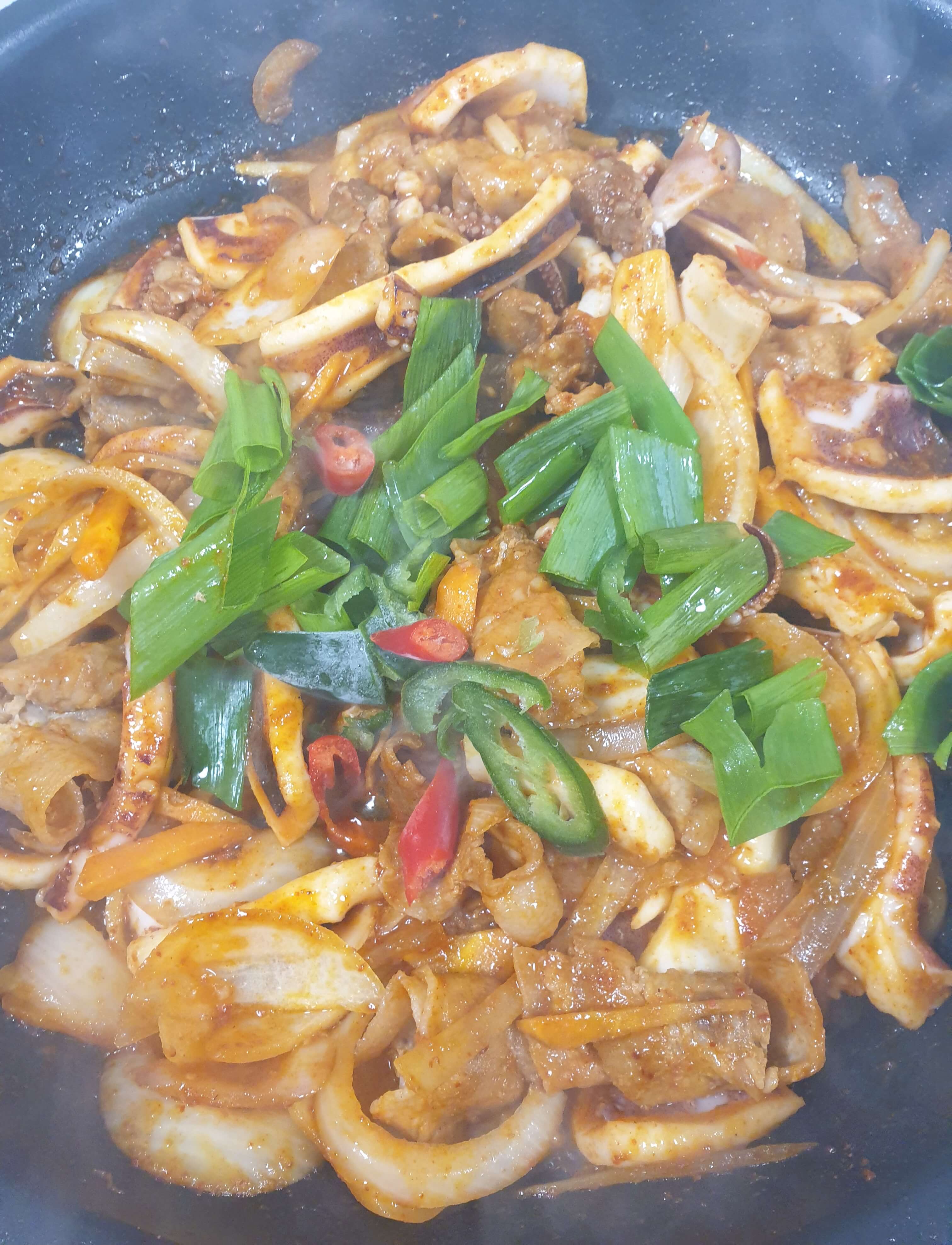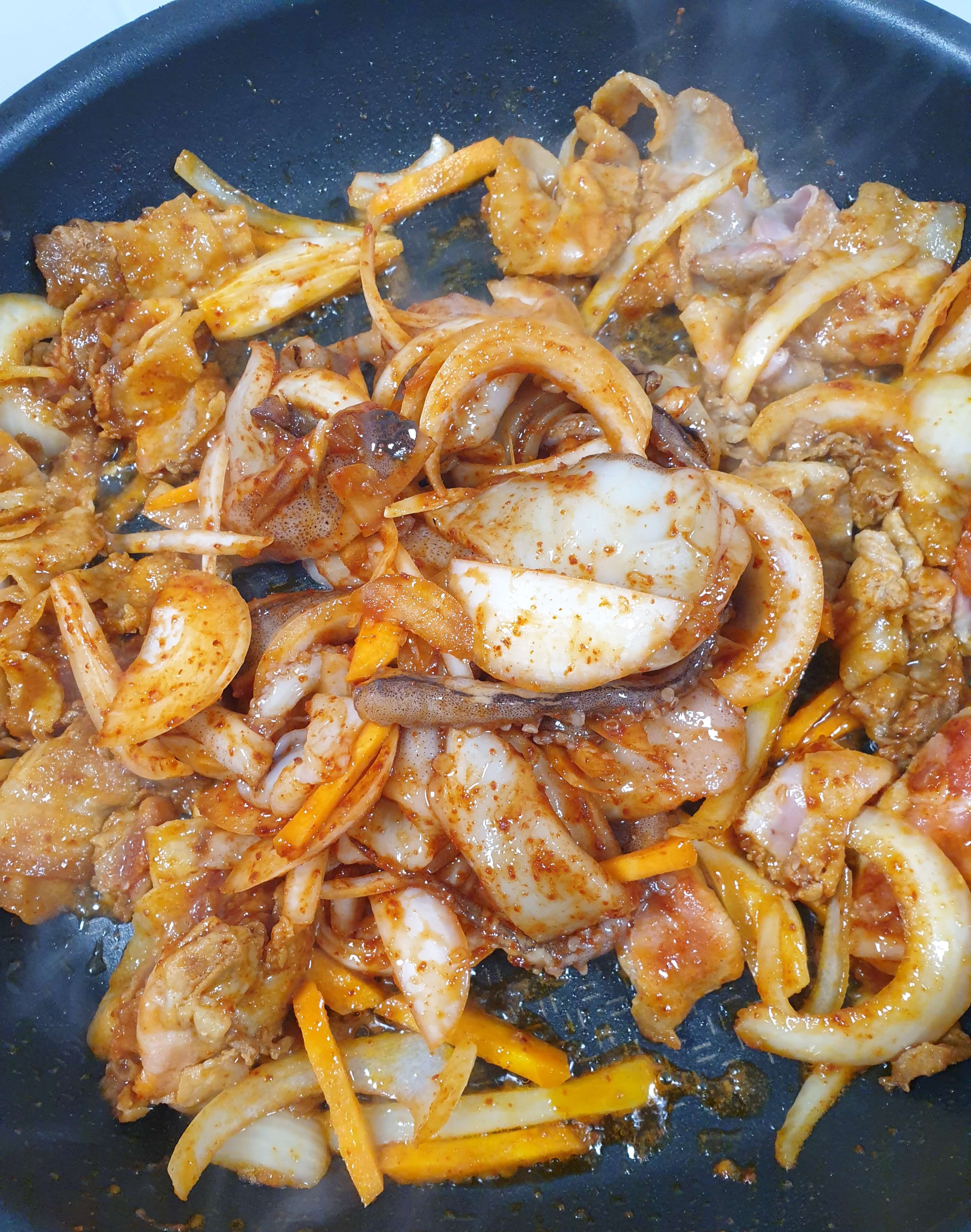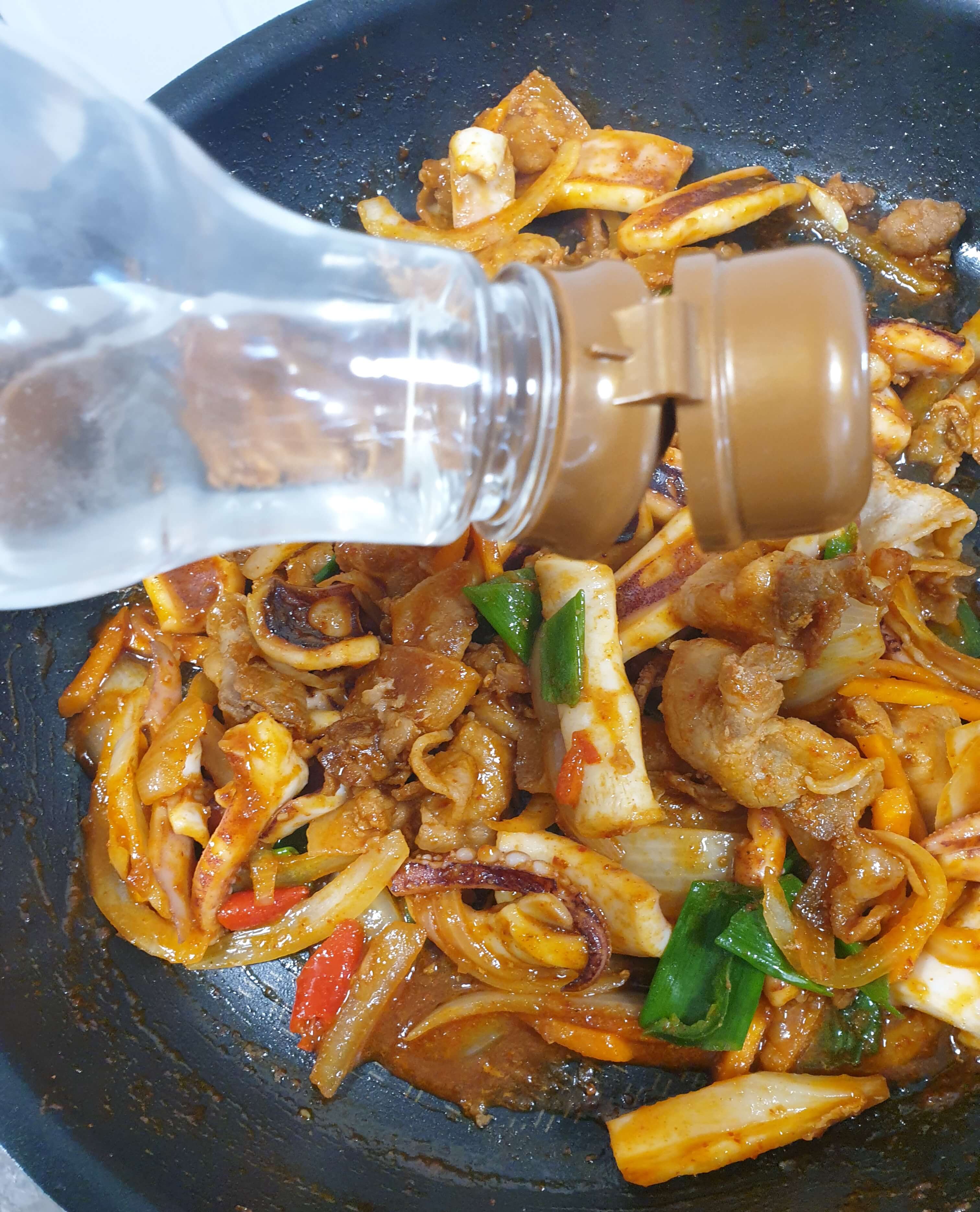 오징어 넣고는 센 불로 휘리릭 볶아 주세요.