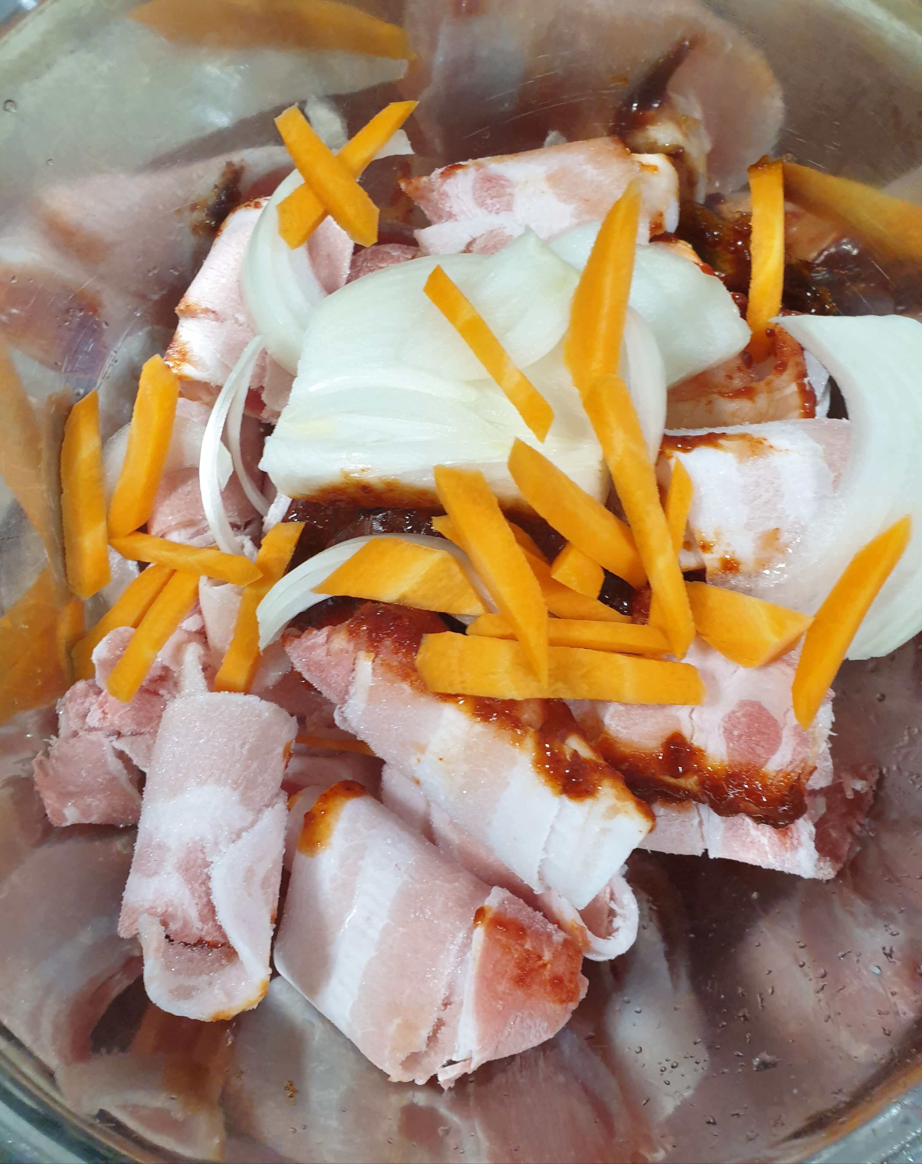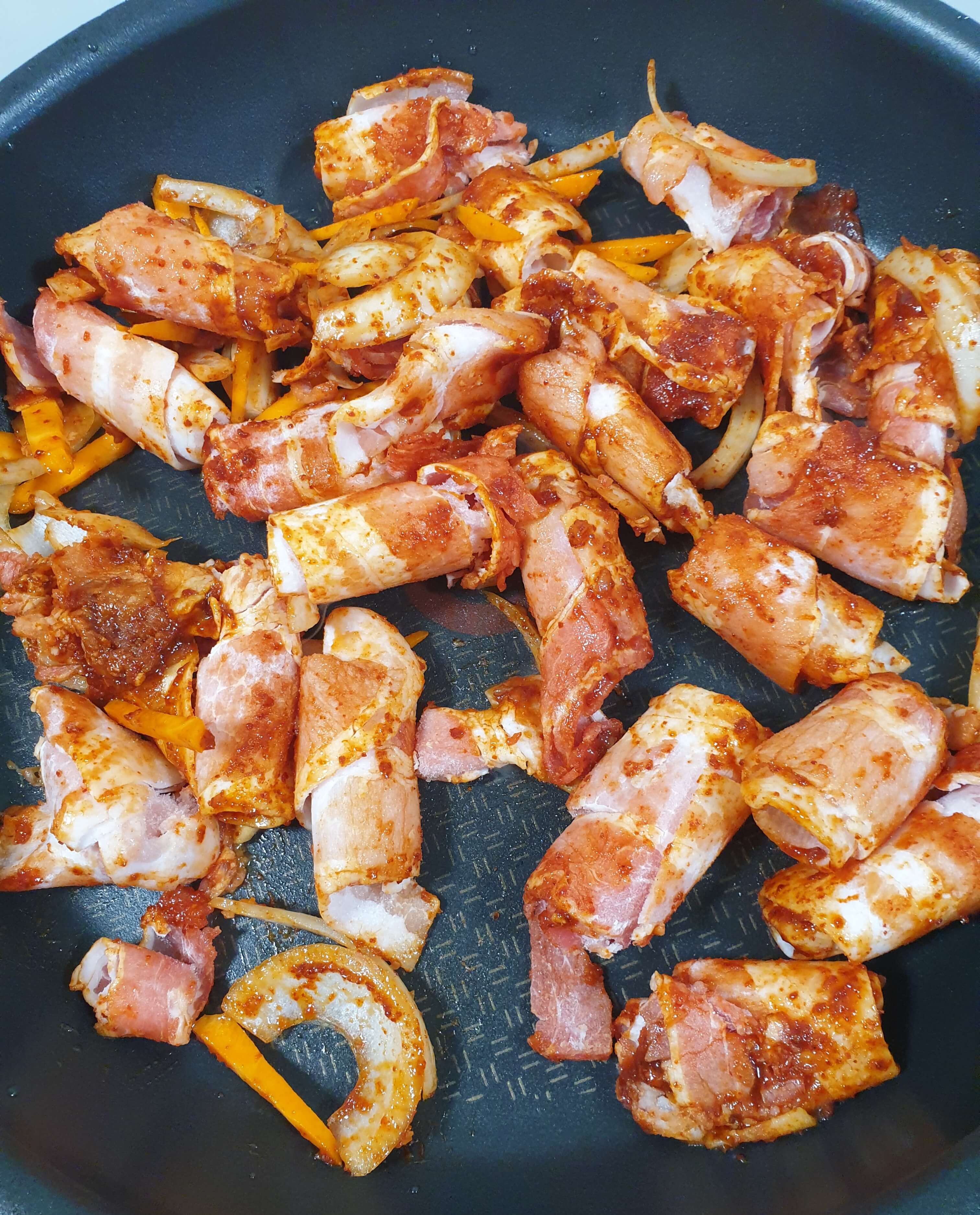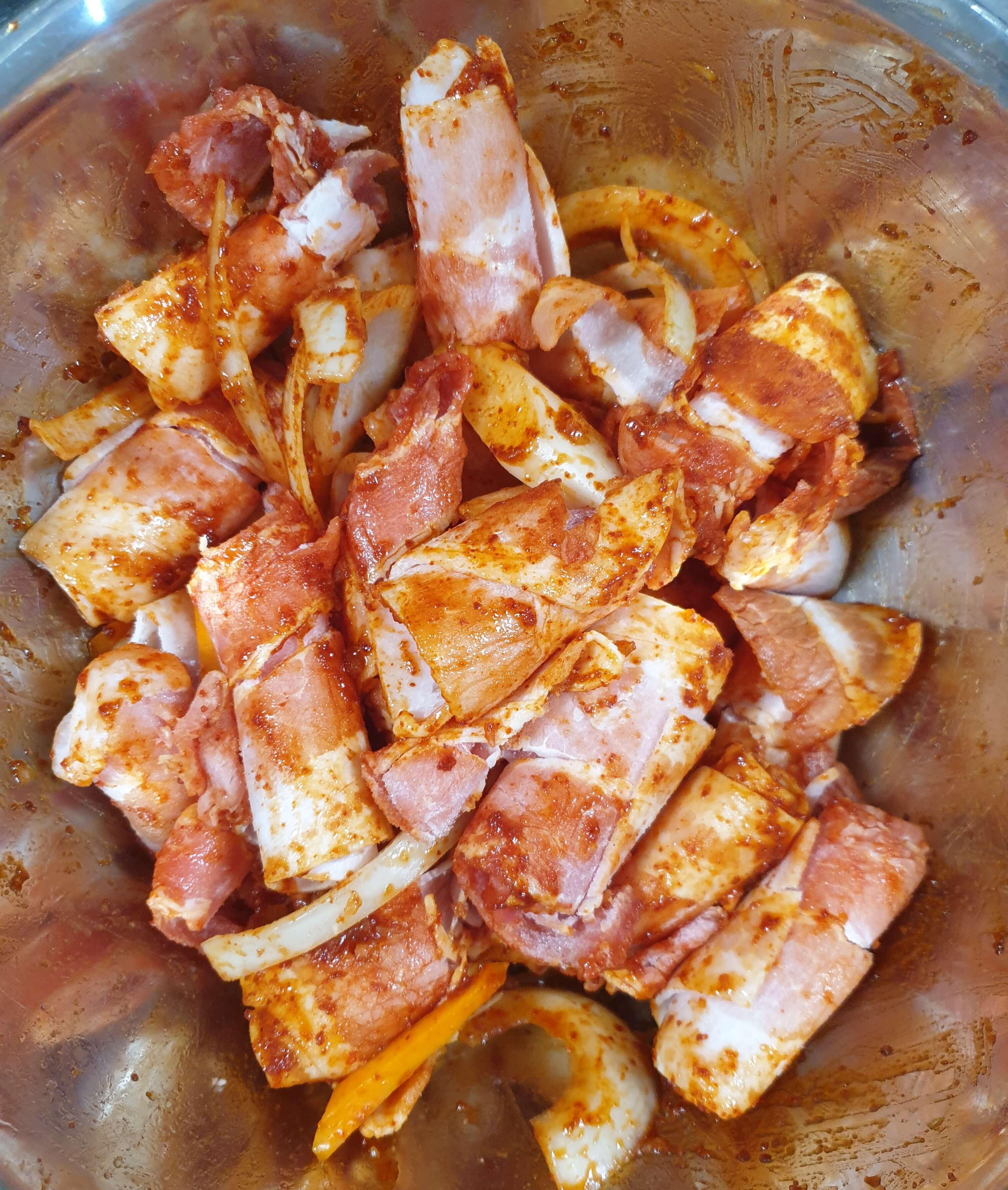 먼저 삼겹살을 약한 불에 볶아주세요.
