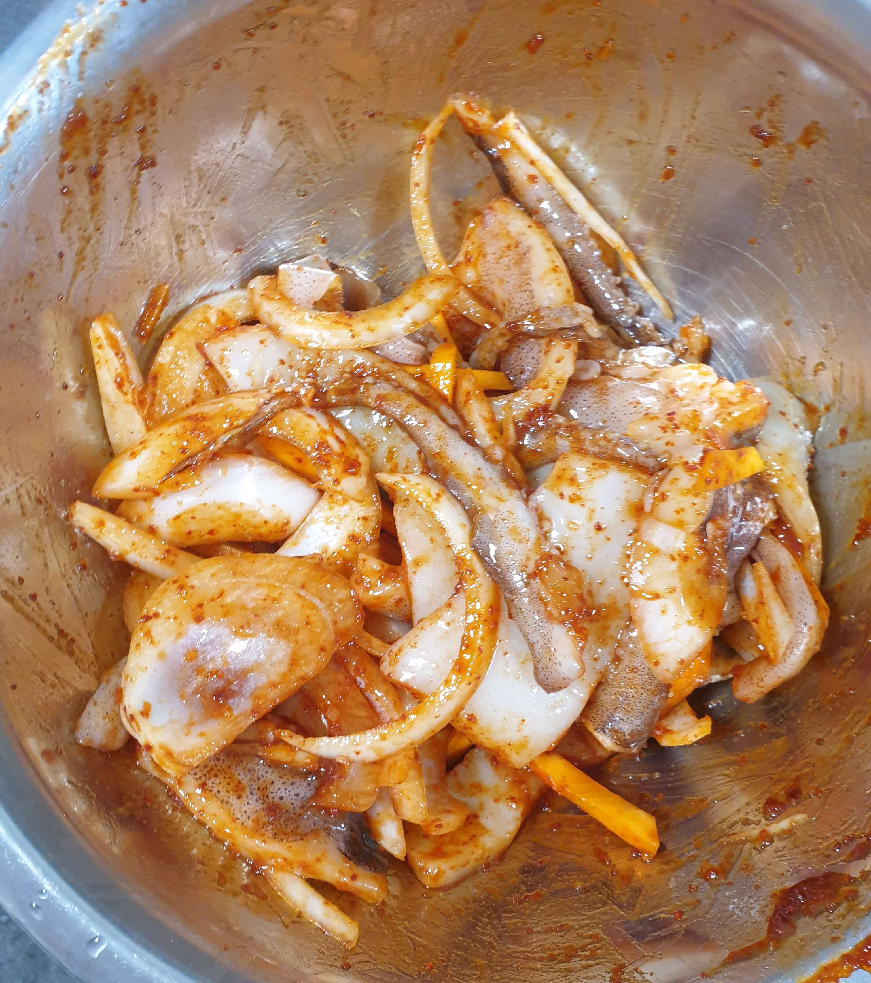 남은 당근, 오징어, 양념장을 넣고 버무려 주세요.