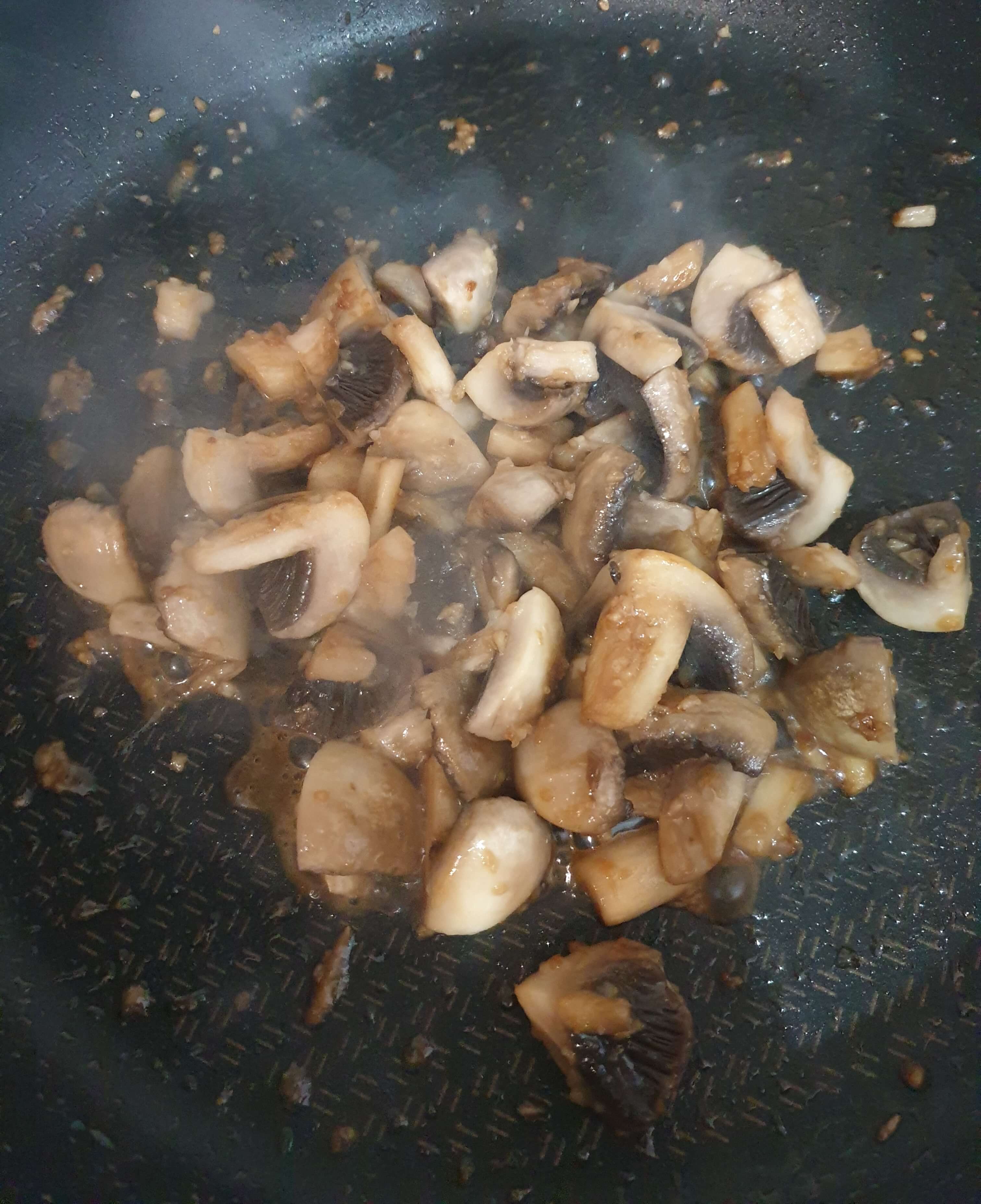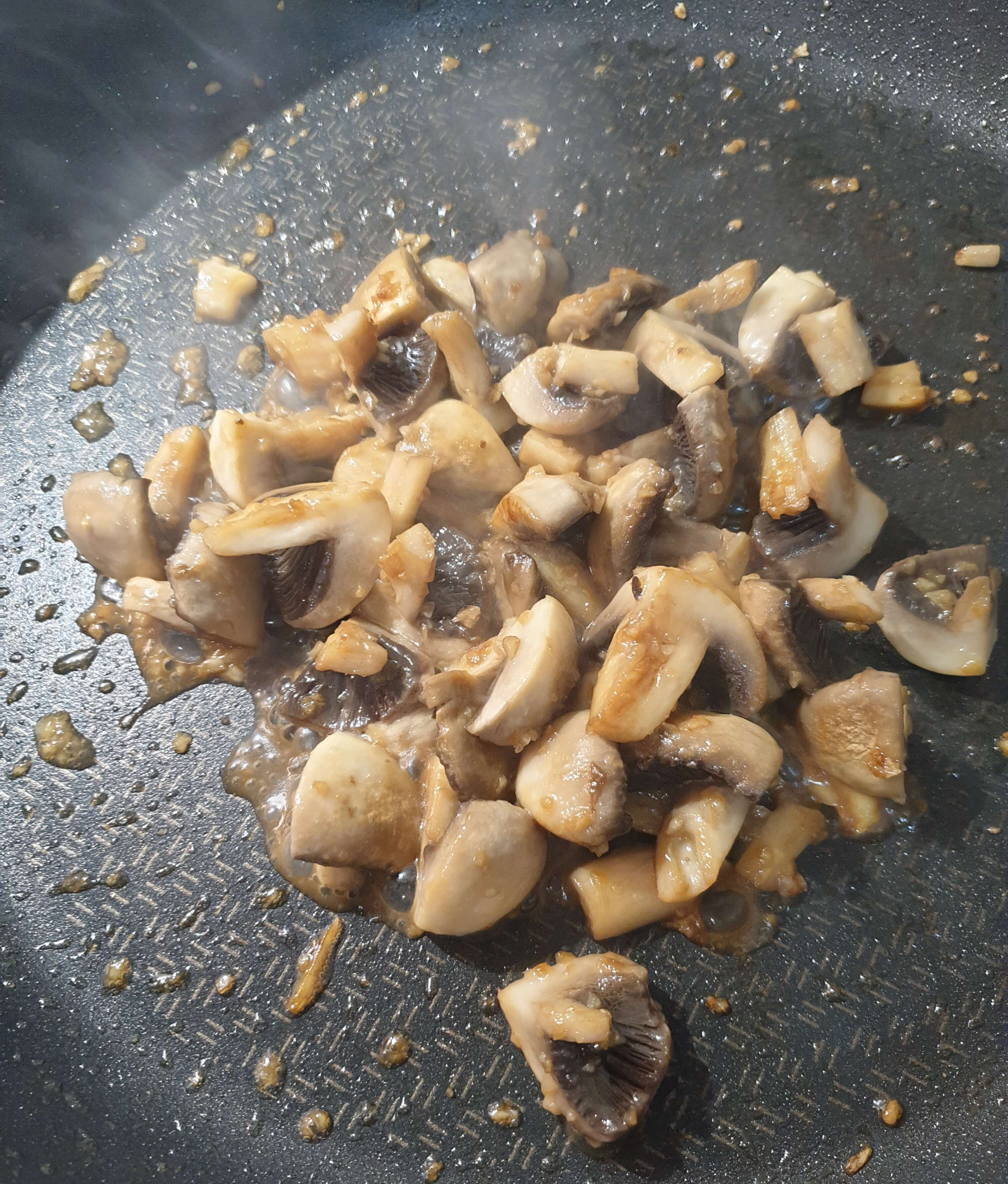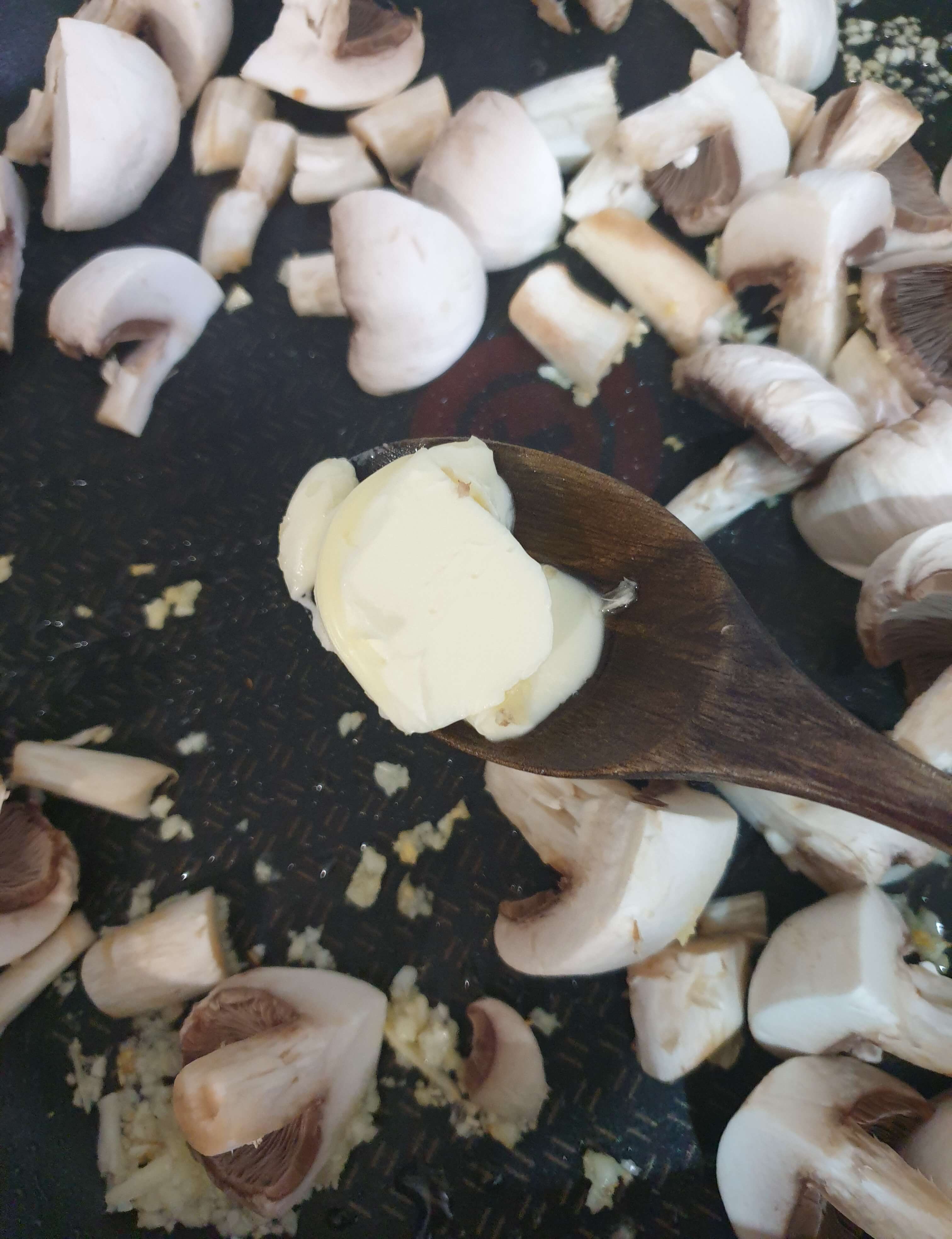 마늘, 버터, 양송이 버섯을 잘 볶은 후