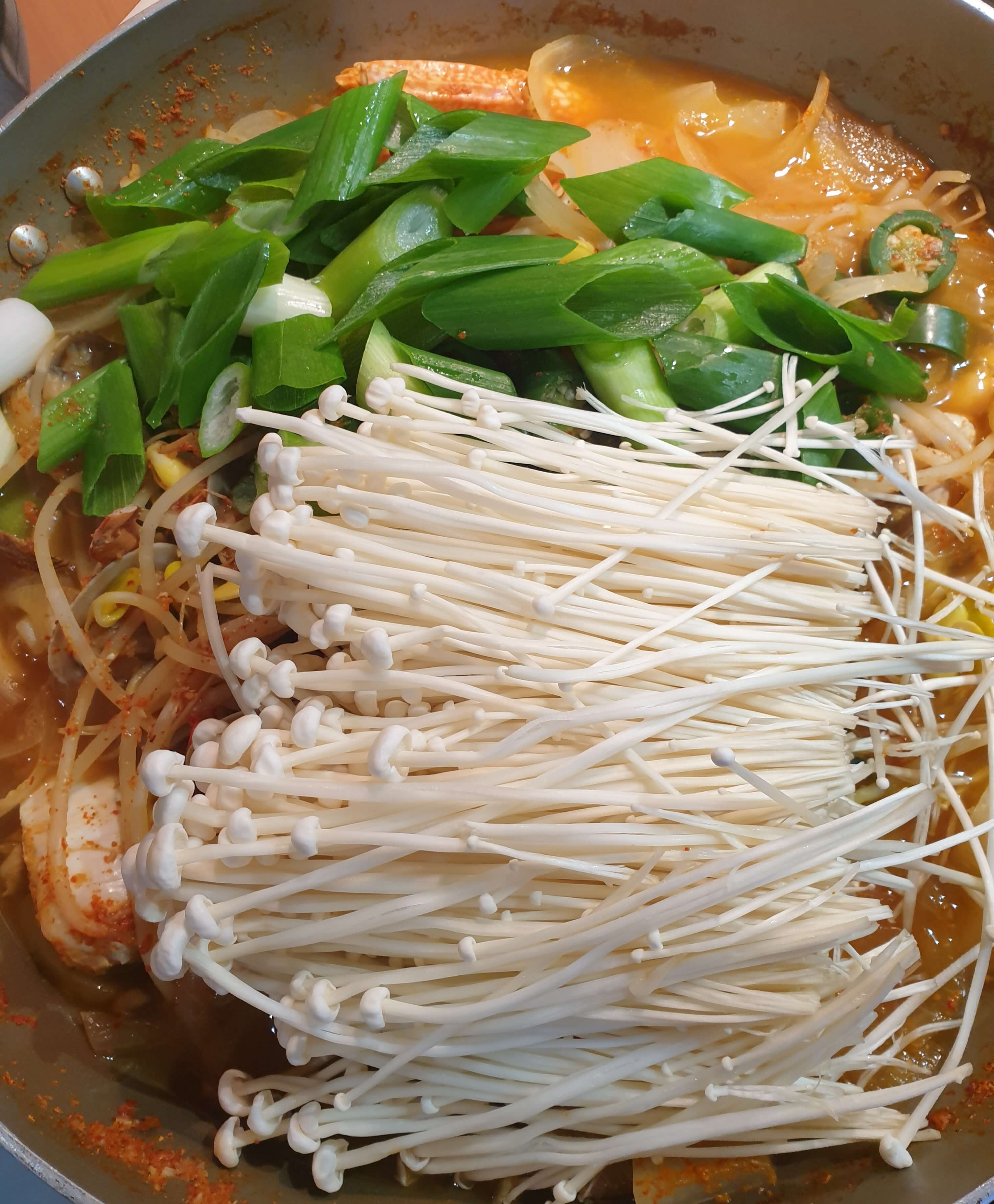 마지막으로 쑥갓과 팽이버섯 1 봉지를 넣어 주세요.