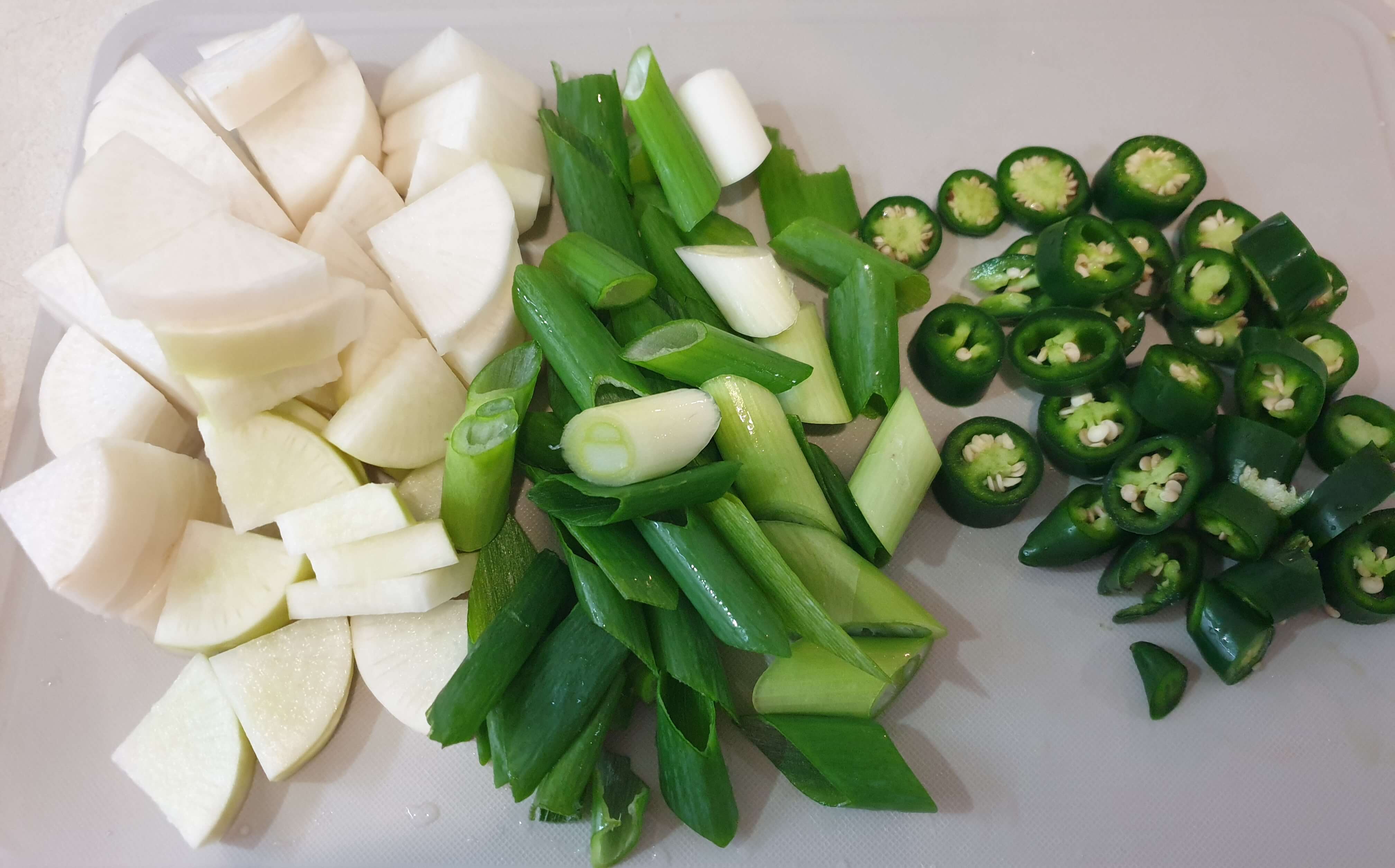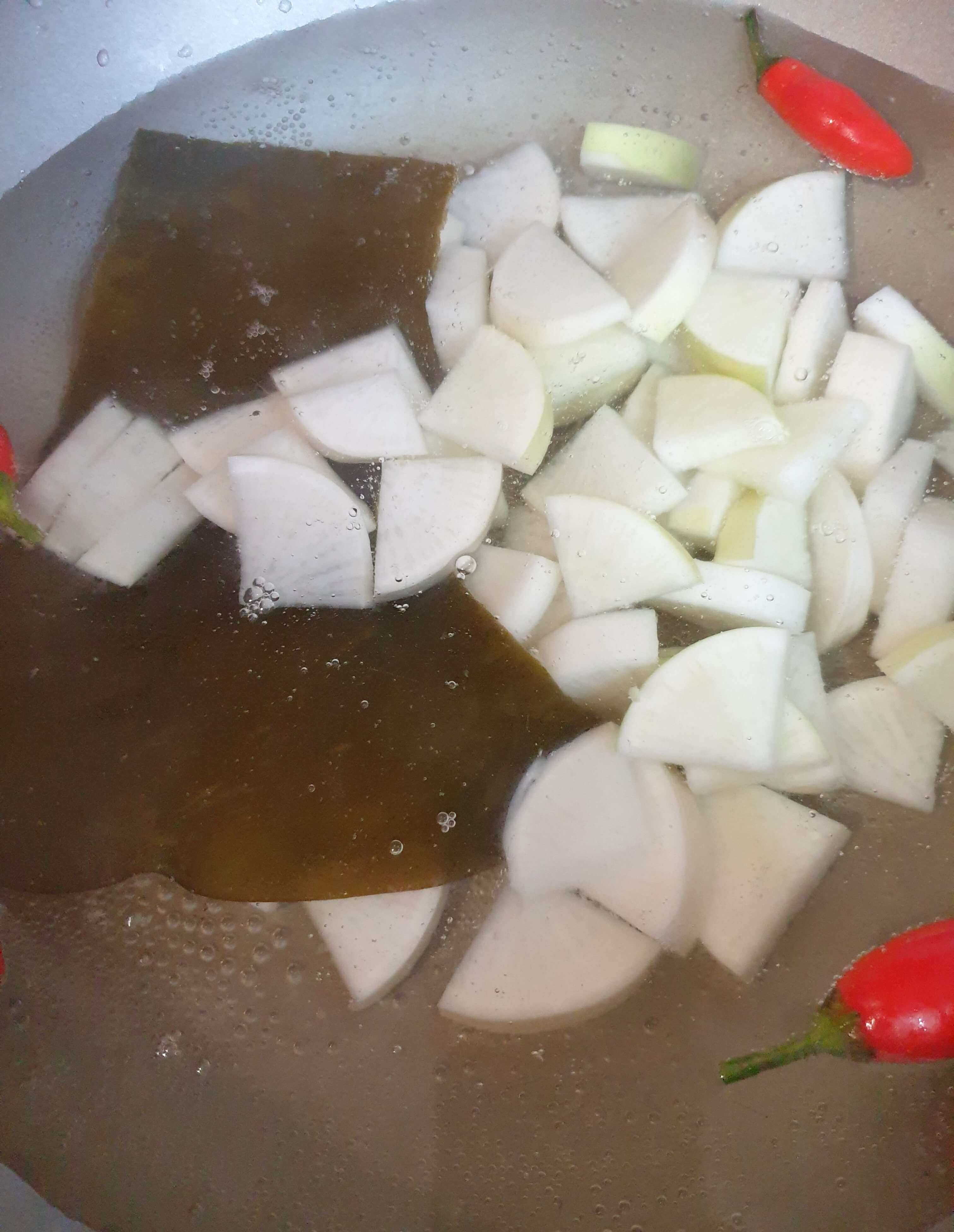물이 끓기 시작하면 썰어놓은 무를 넣고
