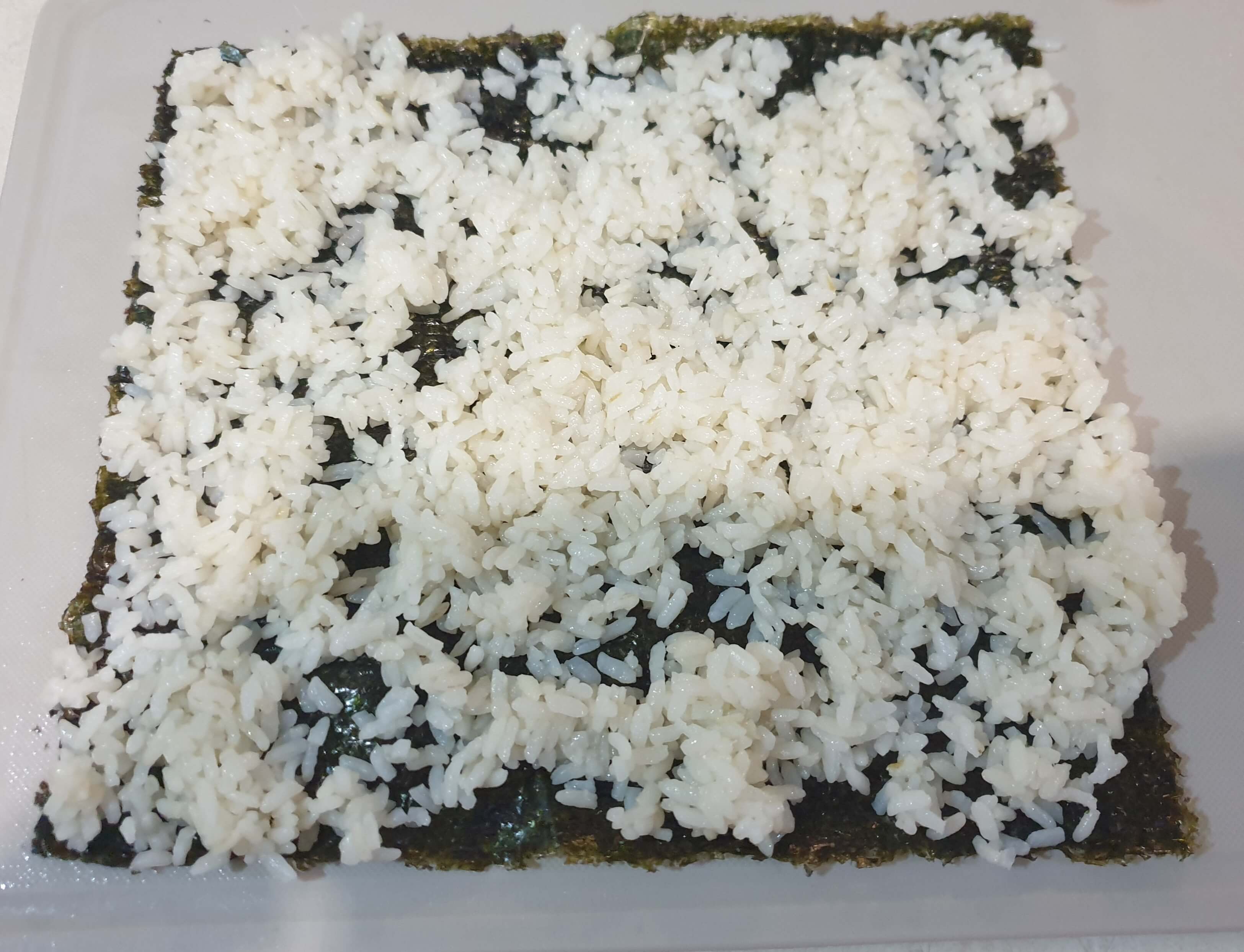 김 2~3cm는 남기고 밥을 깔아 주세요.