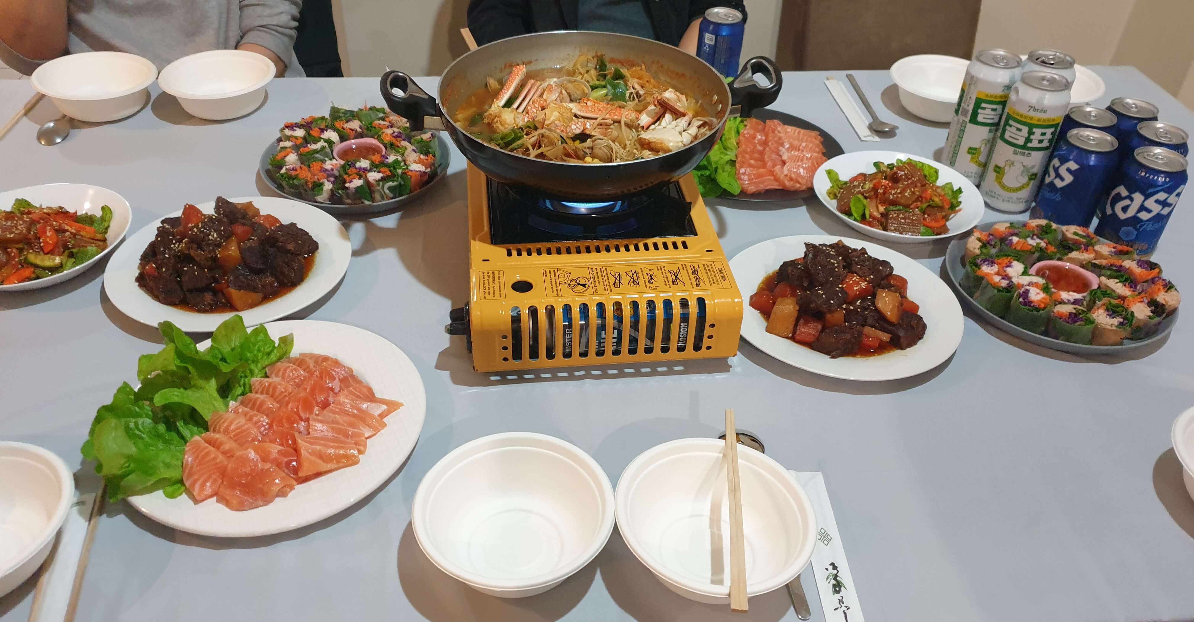 메뉴는 많은 고민 끝에 꽃게탕, 소갈비찜, 숙성 연어, 묵무침, 미니 월남쌈, 연어롤 이렇게 만들었어요.