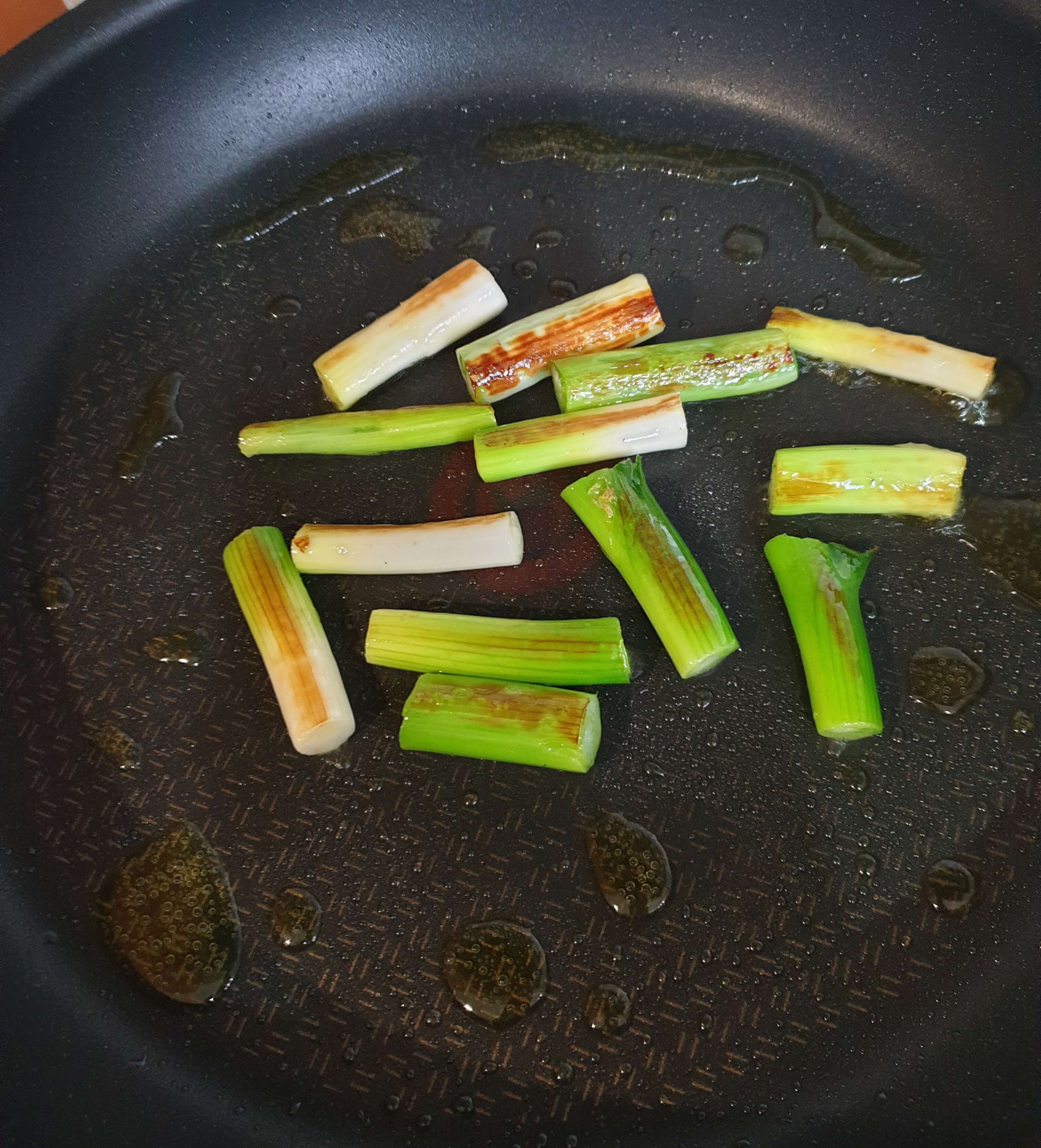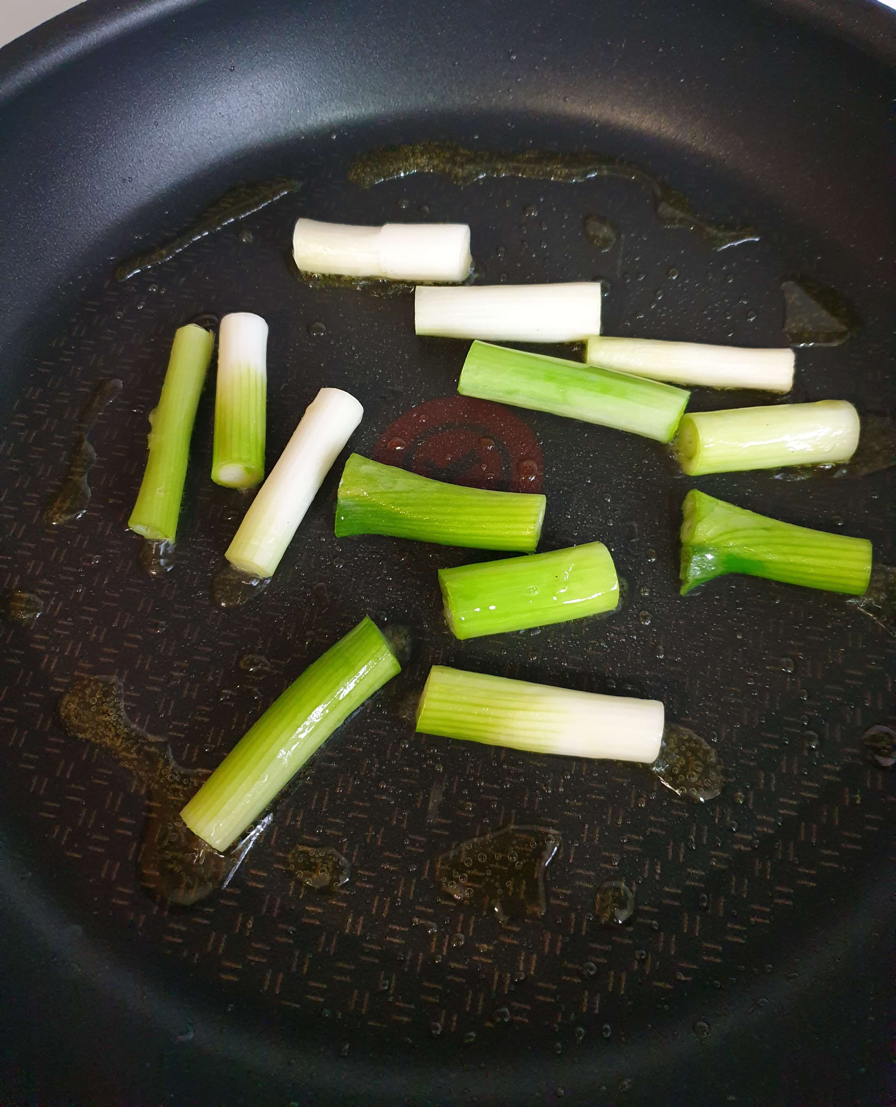 기름이 달궈지면 파를 넣고 노릇하게 구워 주세요.
