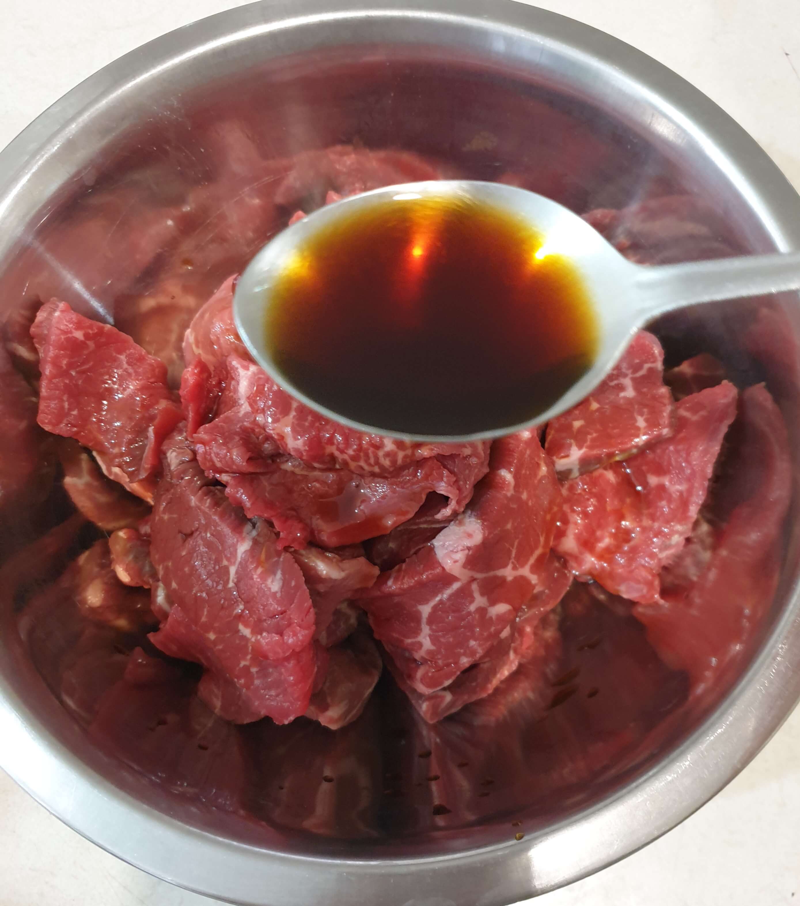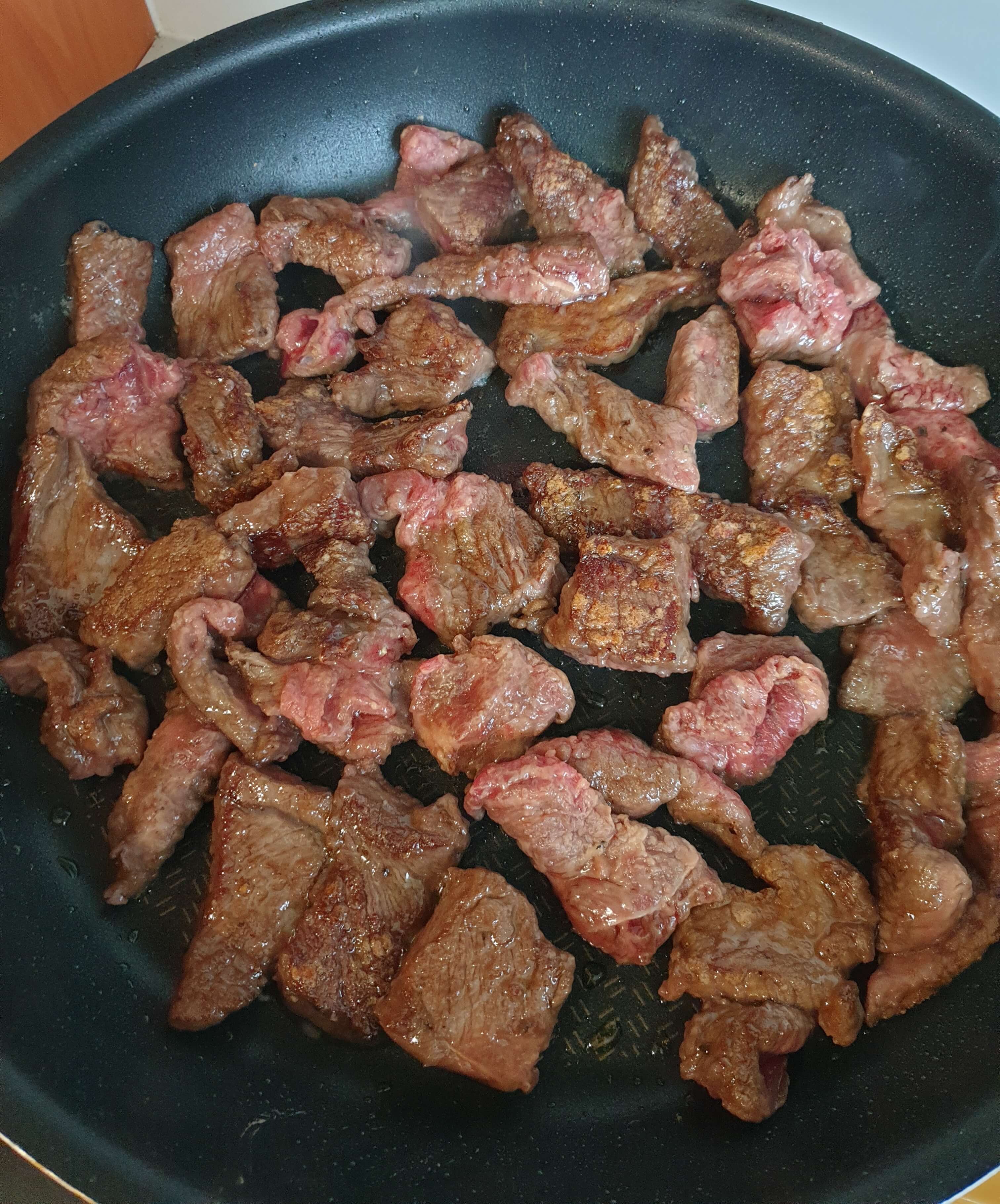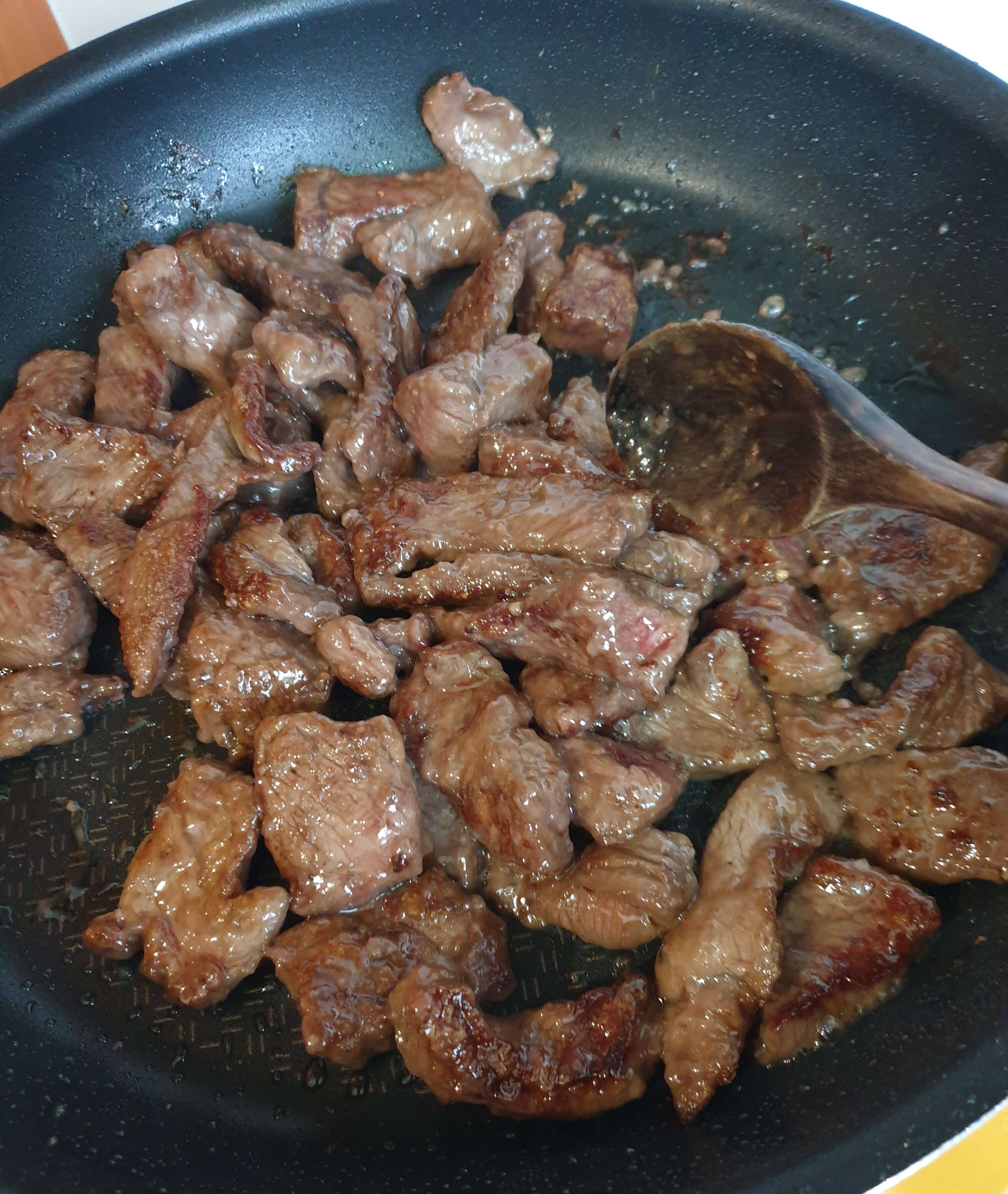 저는 스테이크용 고기를 먹기 좋은 크기로 잘라 사용했어요.