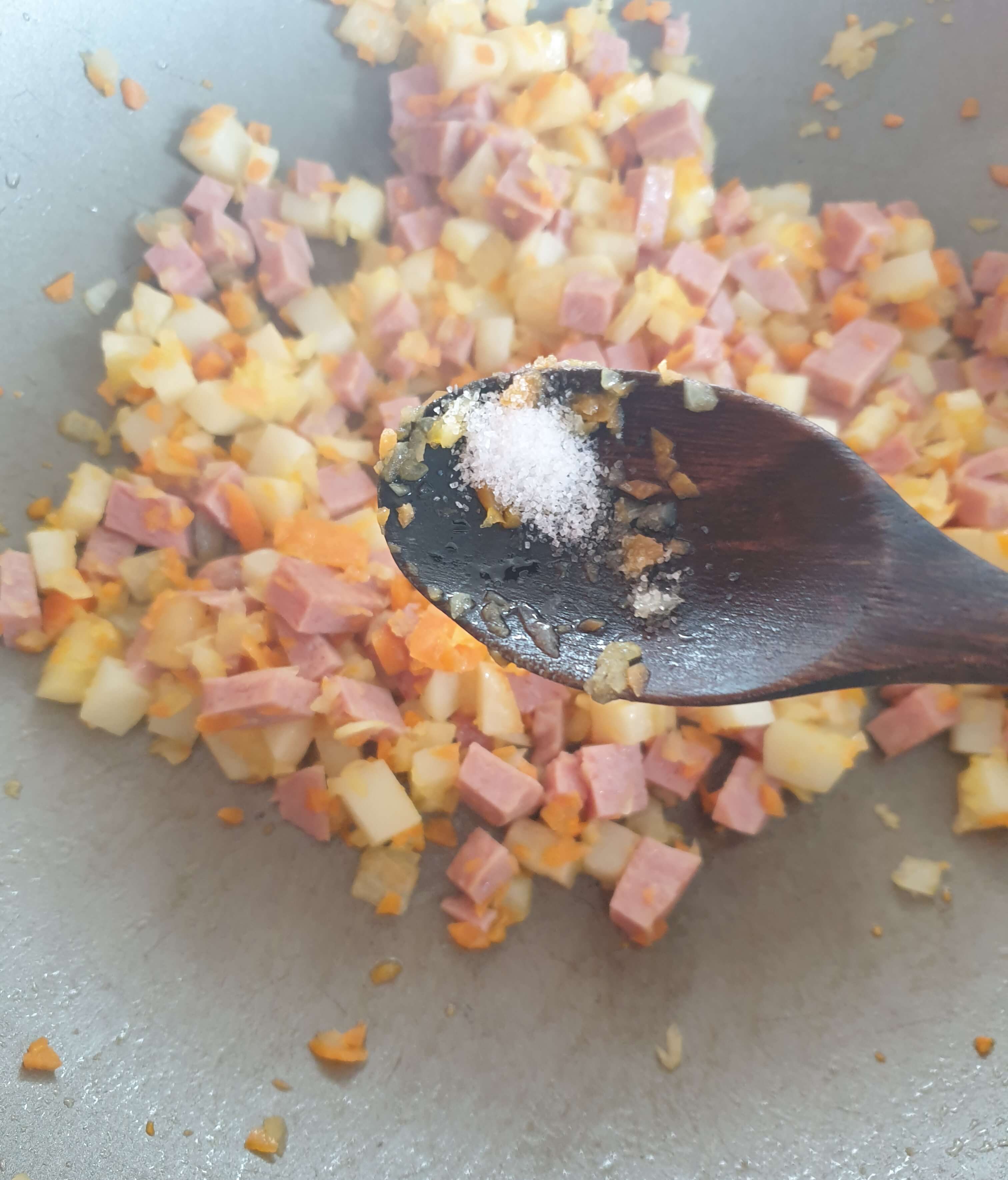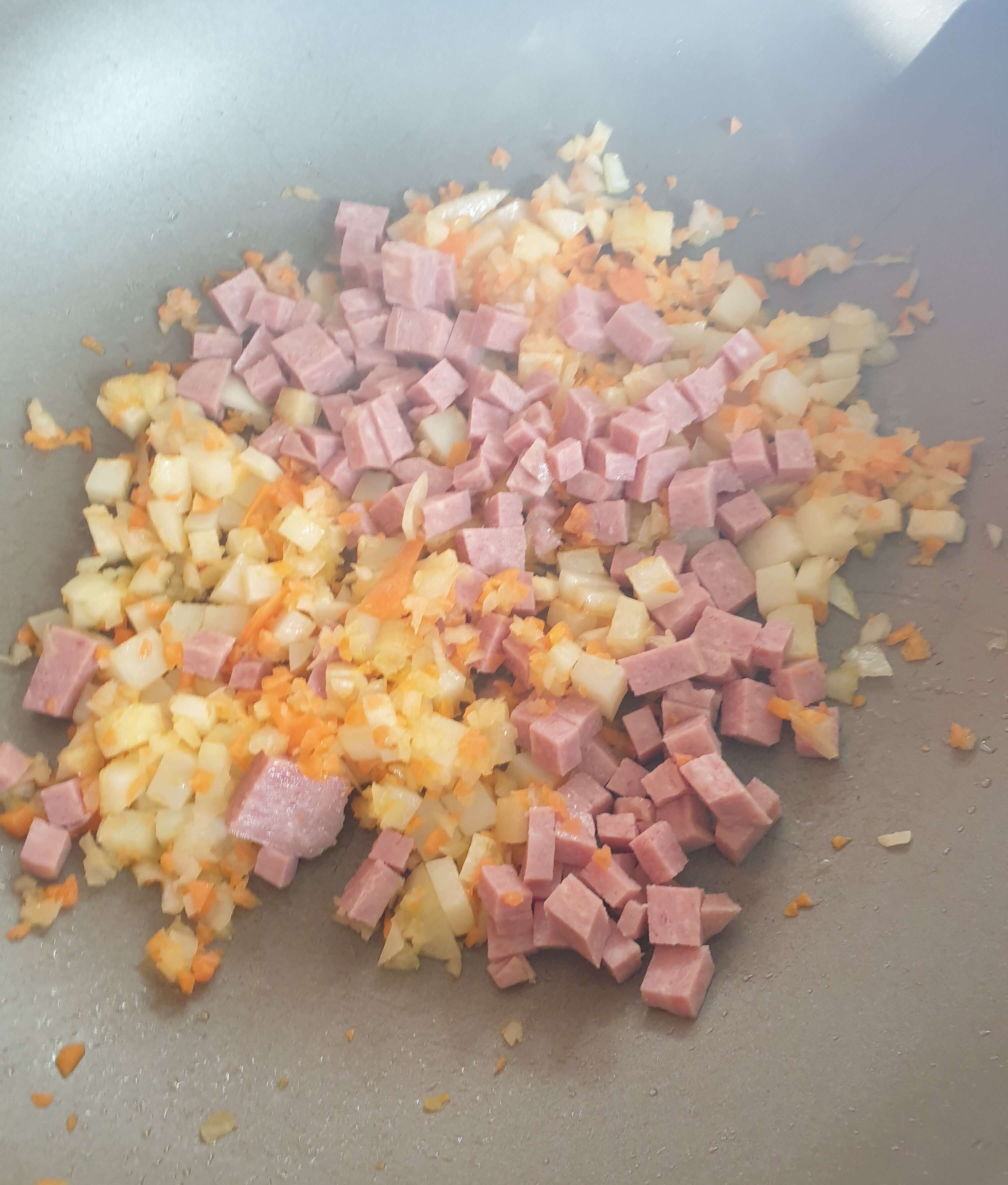 양파와, 당근, 스팸을 넣어 볶아 주세요.