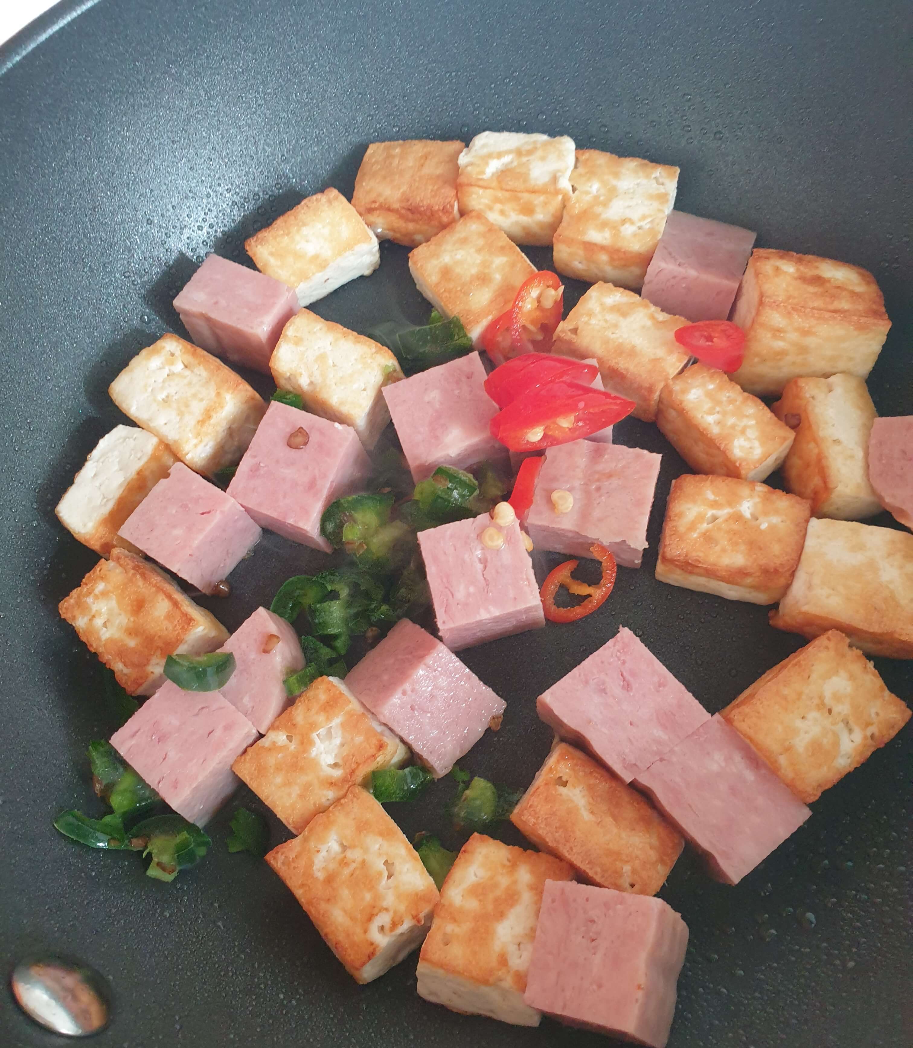 스팸과 썰어놓은 청. 홍 고추를 넣어 볶아주세요.