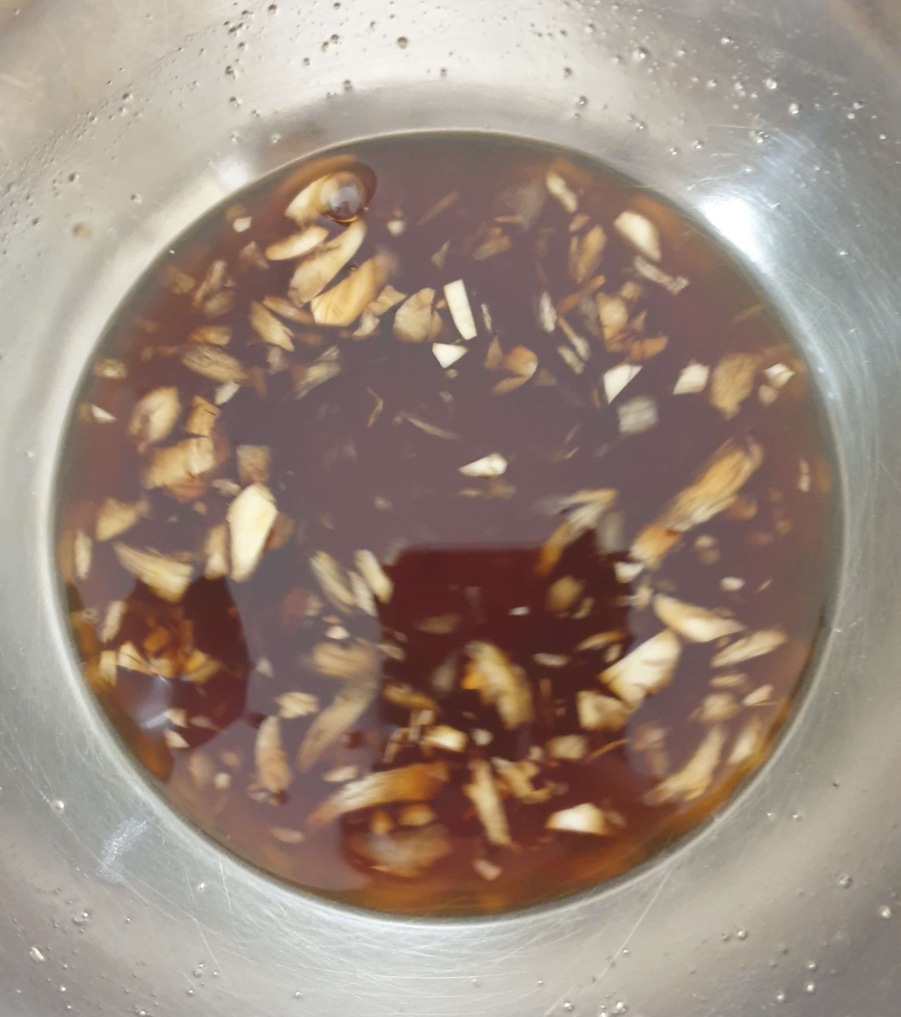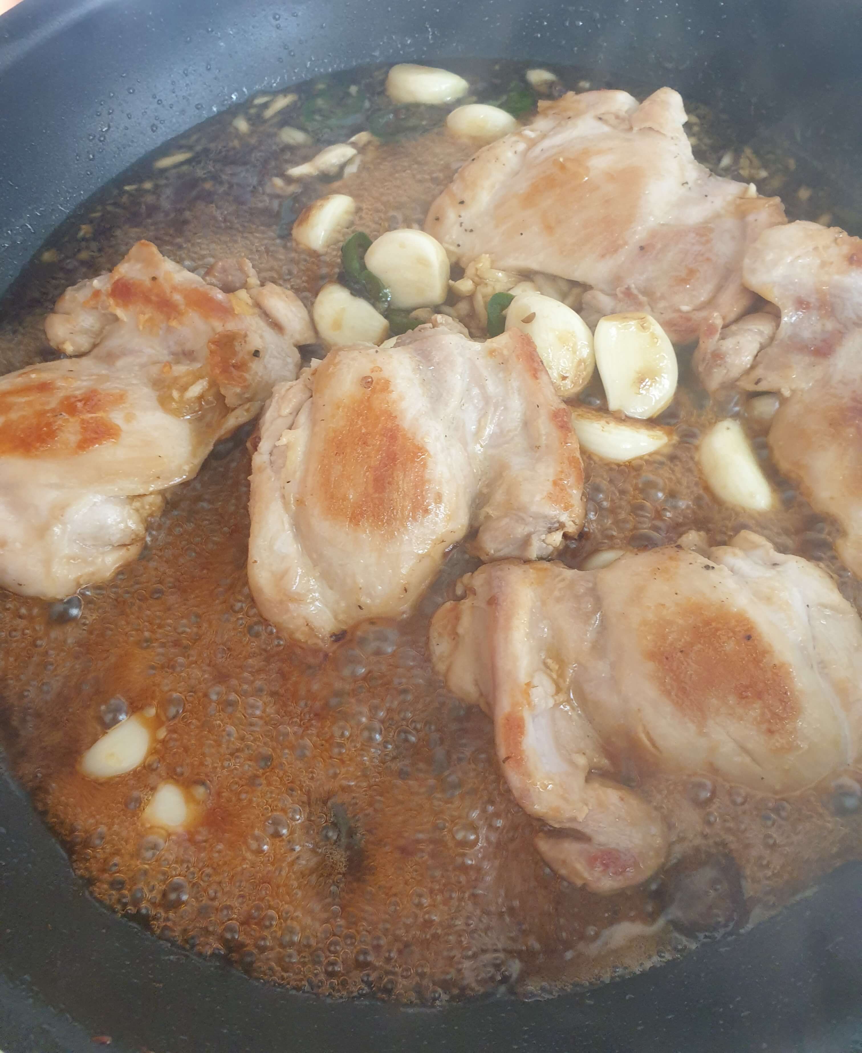 마늘이 노릇하게 익으면 소스를 부어주세요.