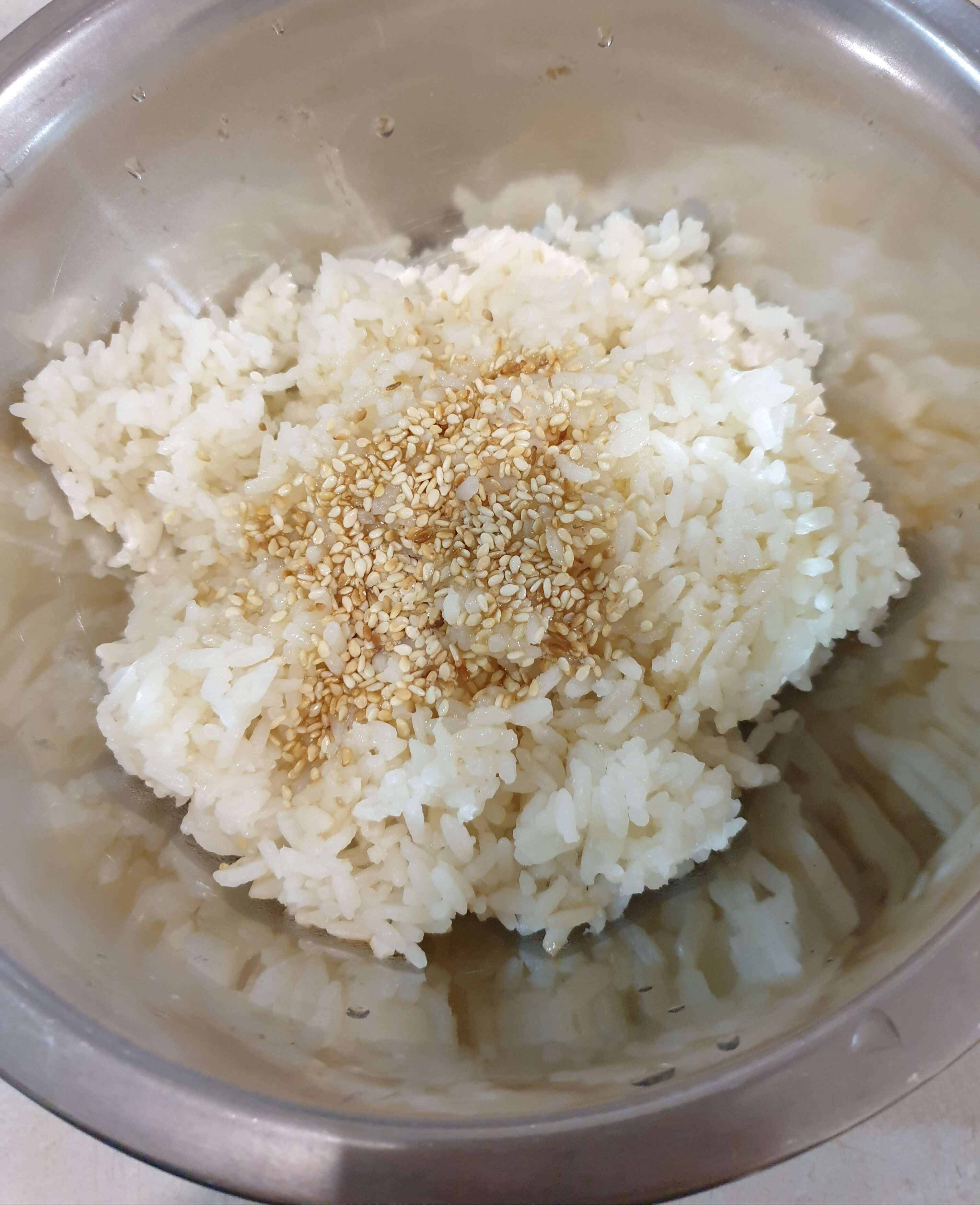 밥 약 2 공기에 소금, 통깨, 참기름을 넣고