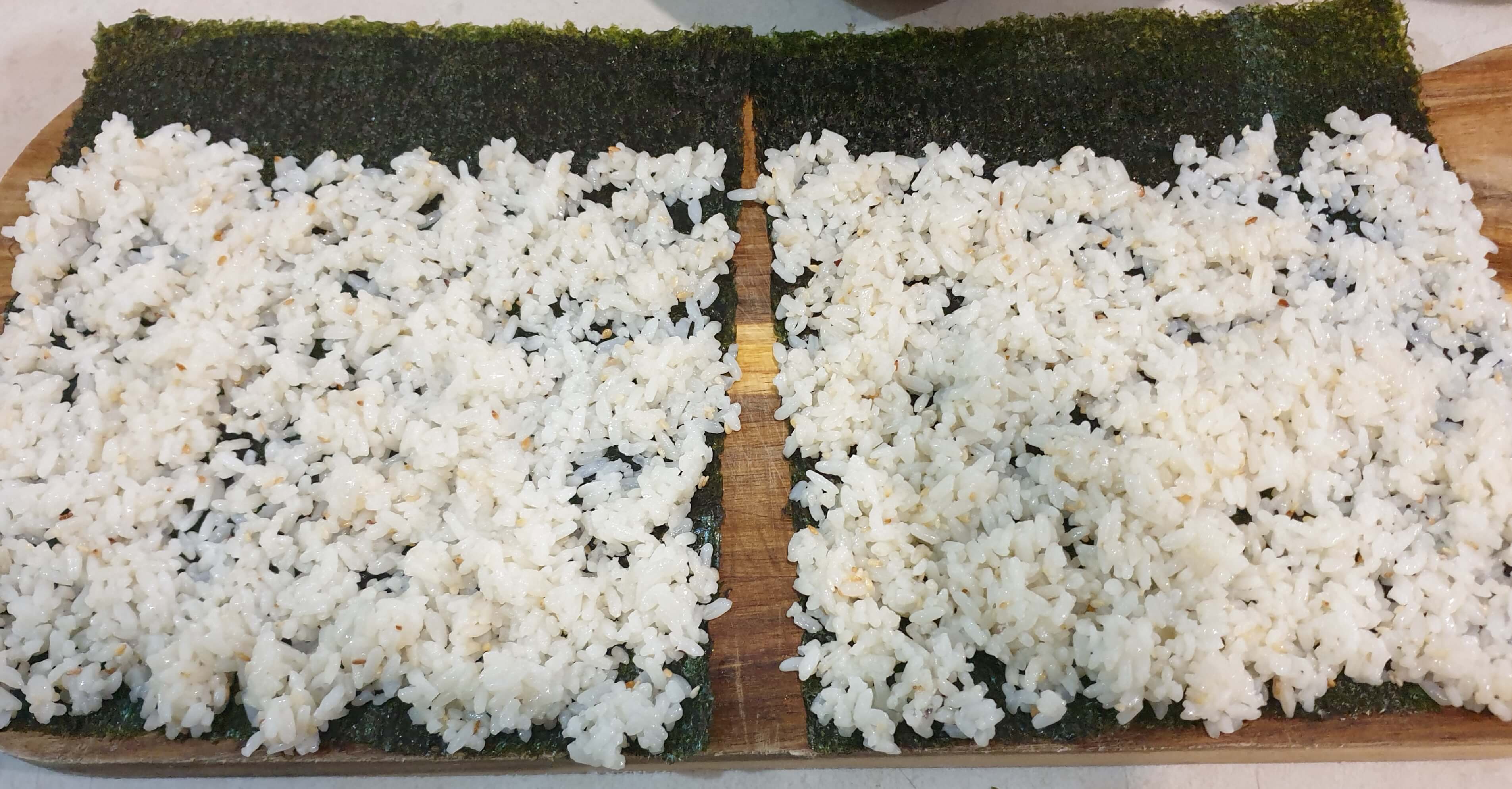 밥을 너무 얇지도 두껍지도 않게 깔아주세요.