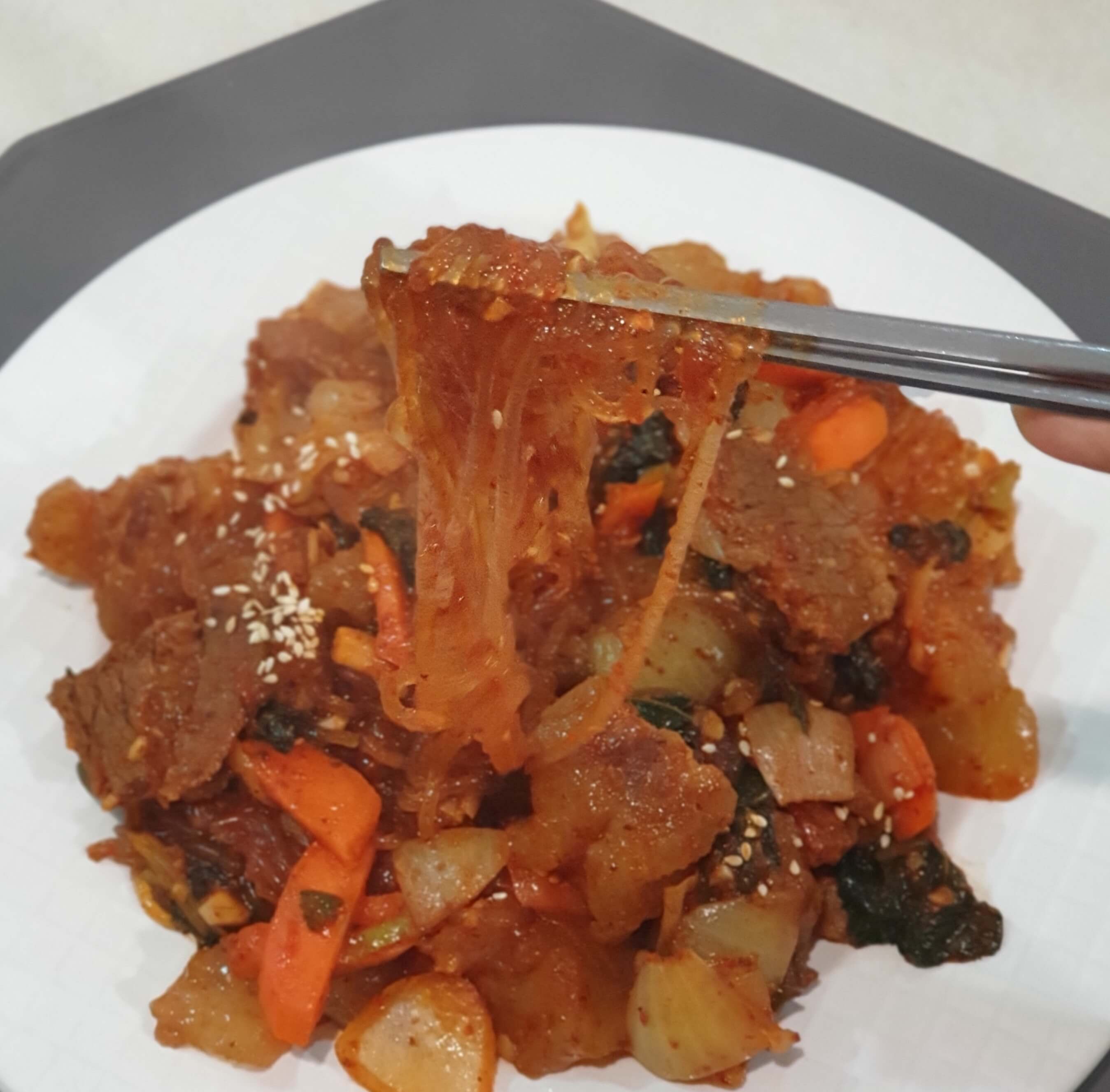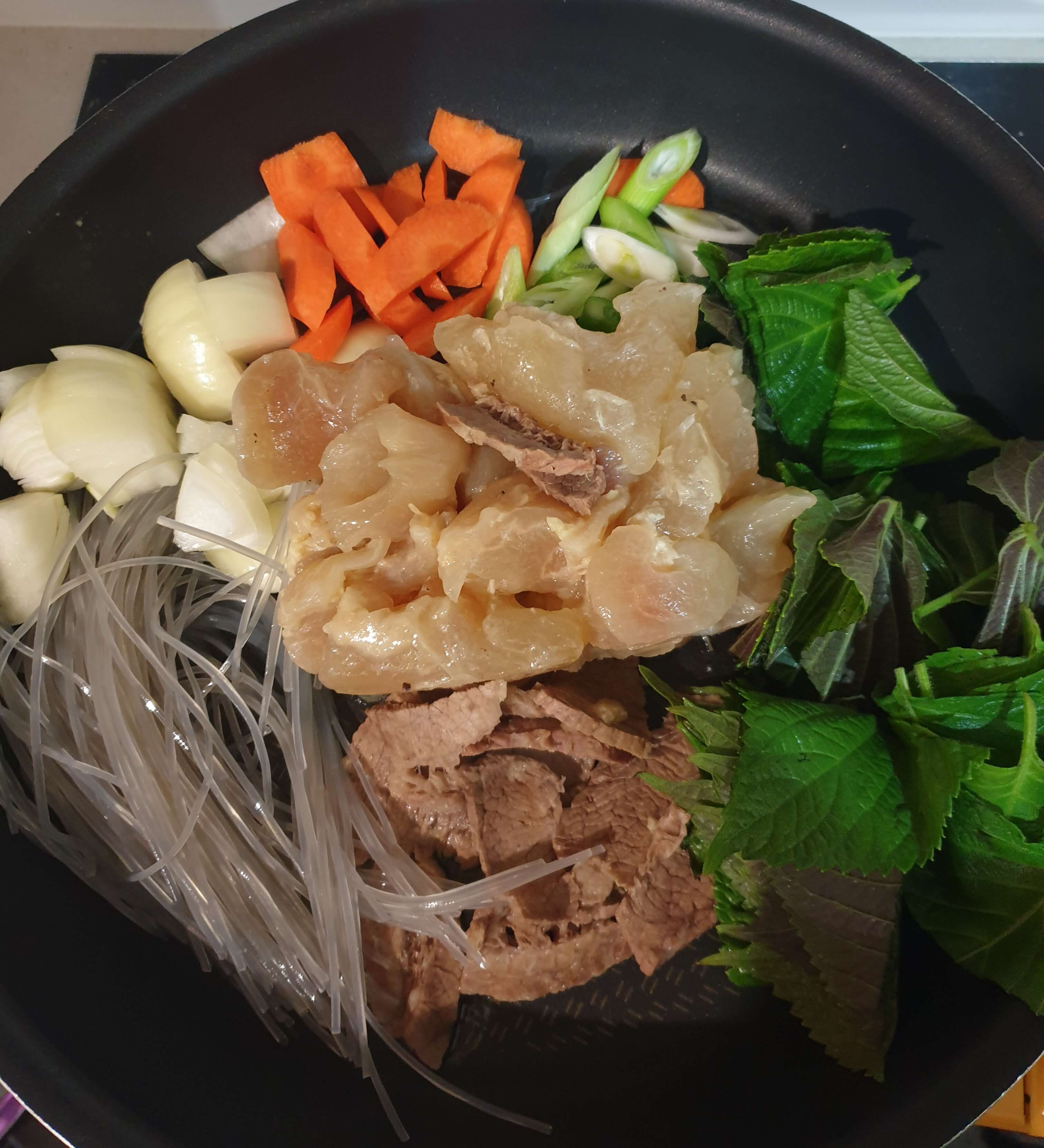 팬에 스지, 야채, 불린 당면, 삶은 양지, 소스를 넣어주세요.