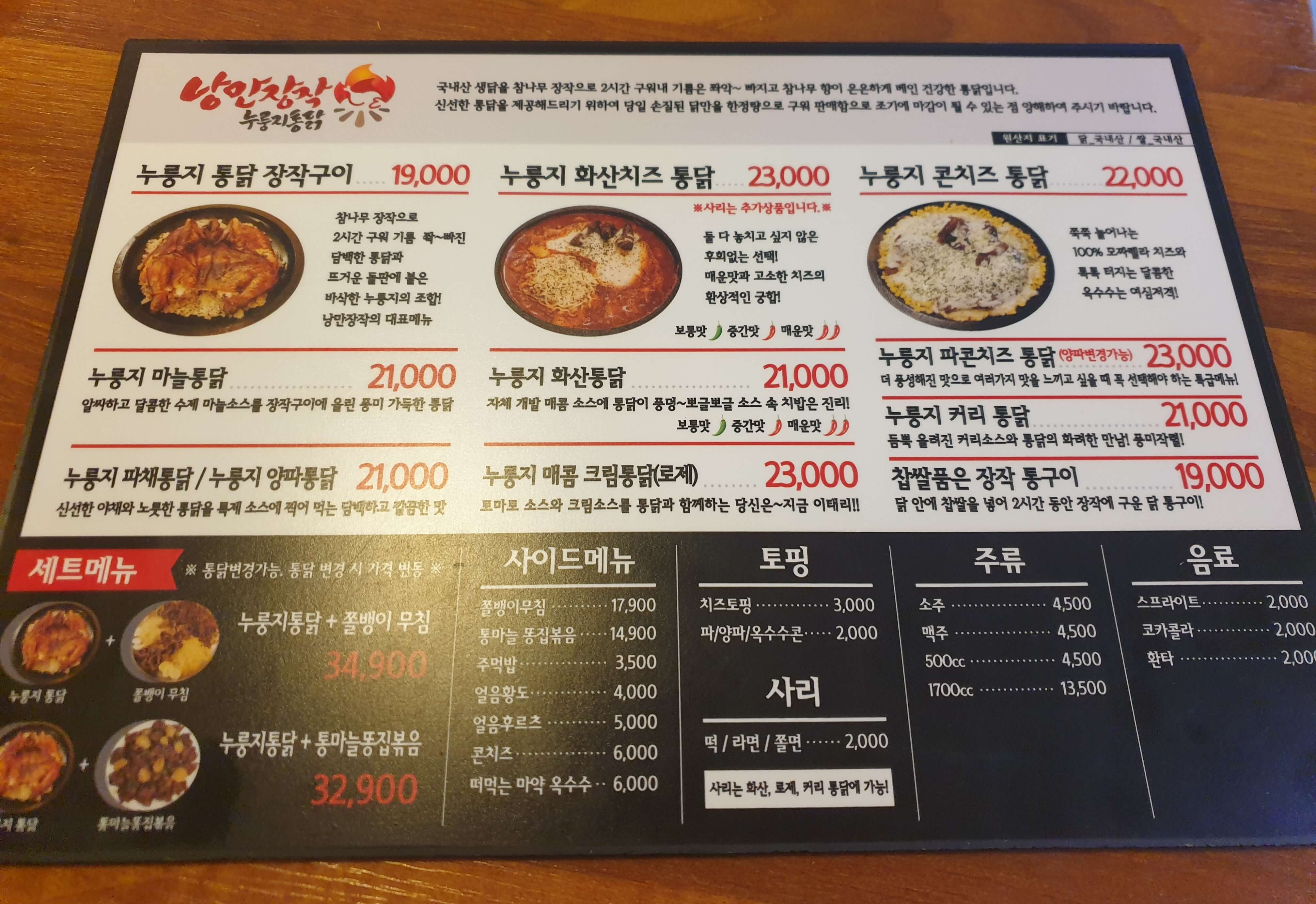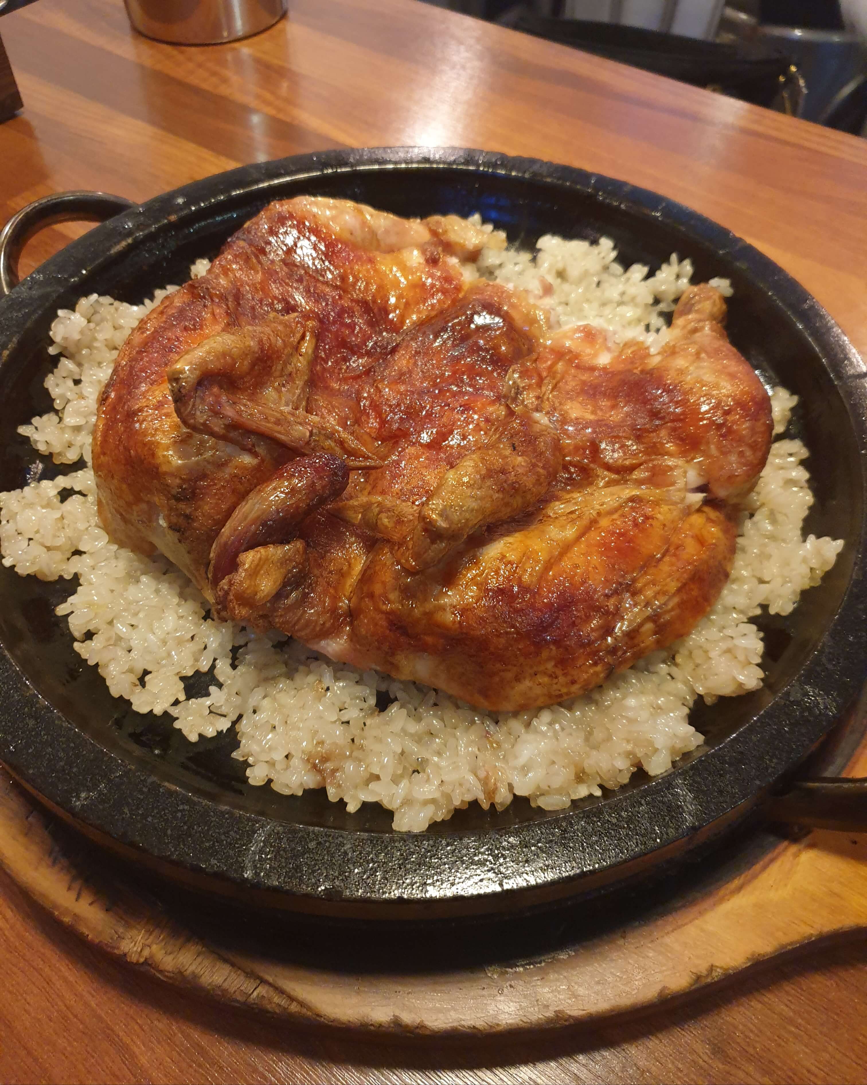 어른들만 있었으면 누룽지 화산 통닭을 시켰겠지만 아이가 있으니 가장 기본으로 보이는 누룽지 통닭 장작구이로 택했다.