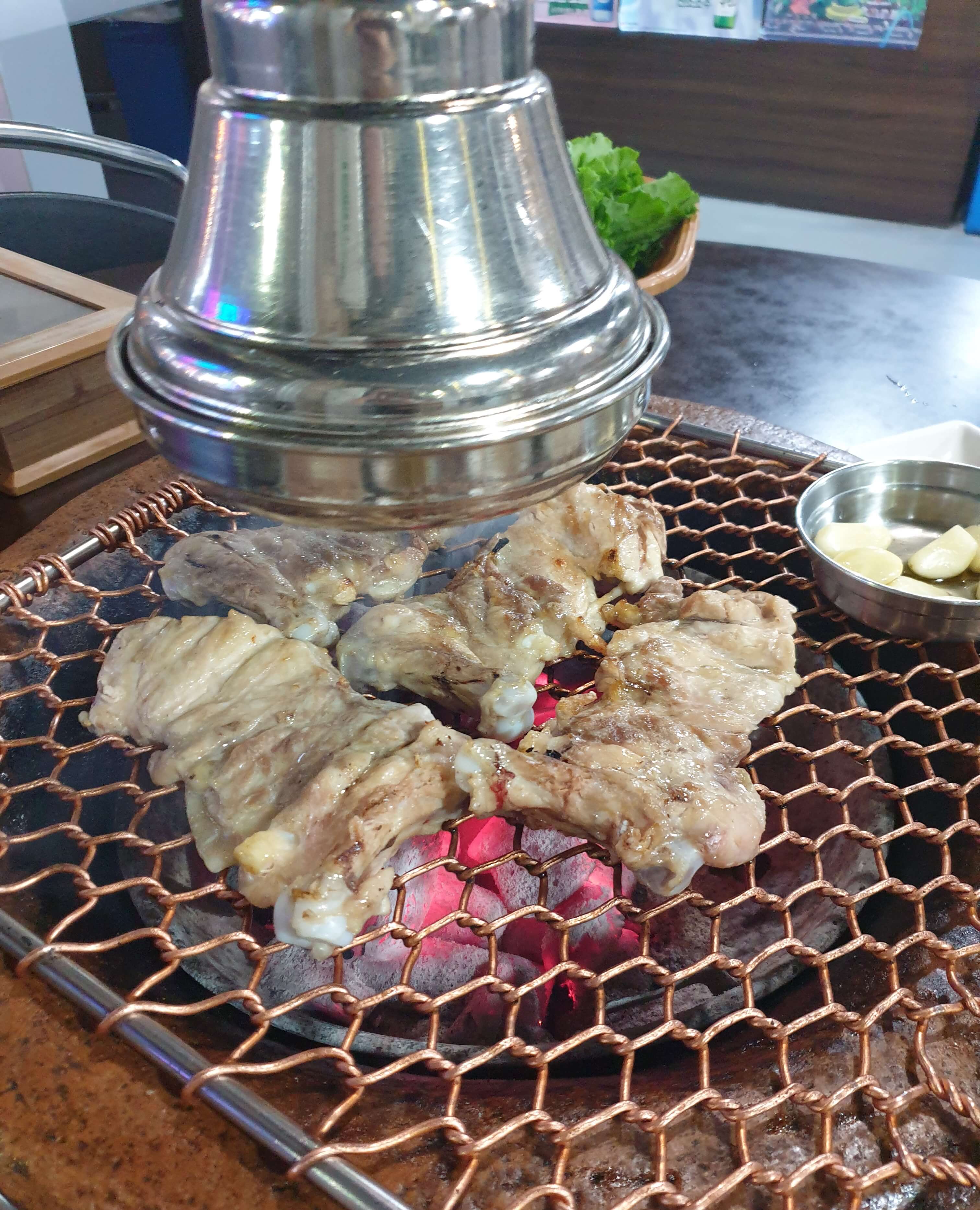 초벌 된 닭고기를 참숯에 올리고 맛있게 굽기만 하면 바로 먹을 수 있다.