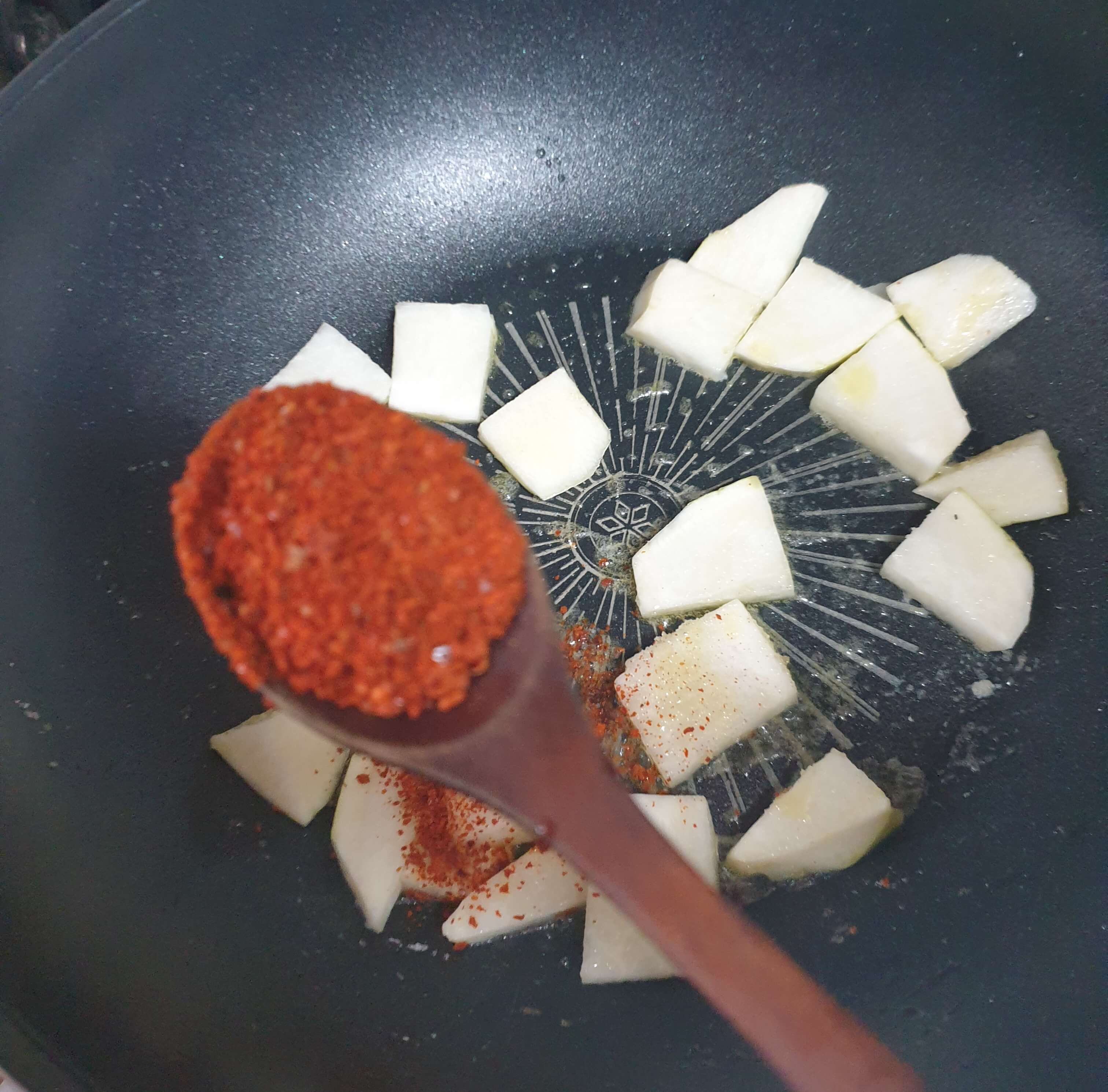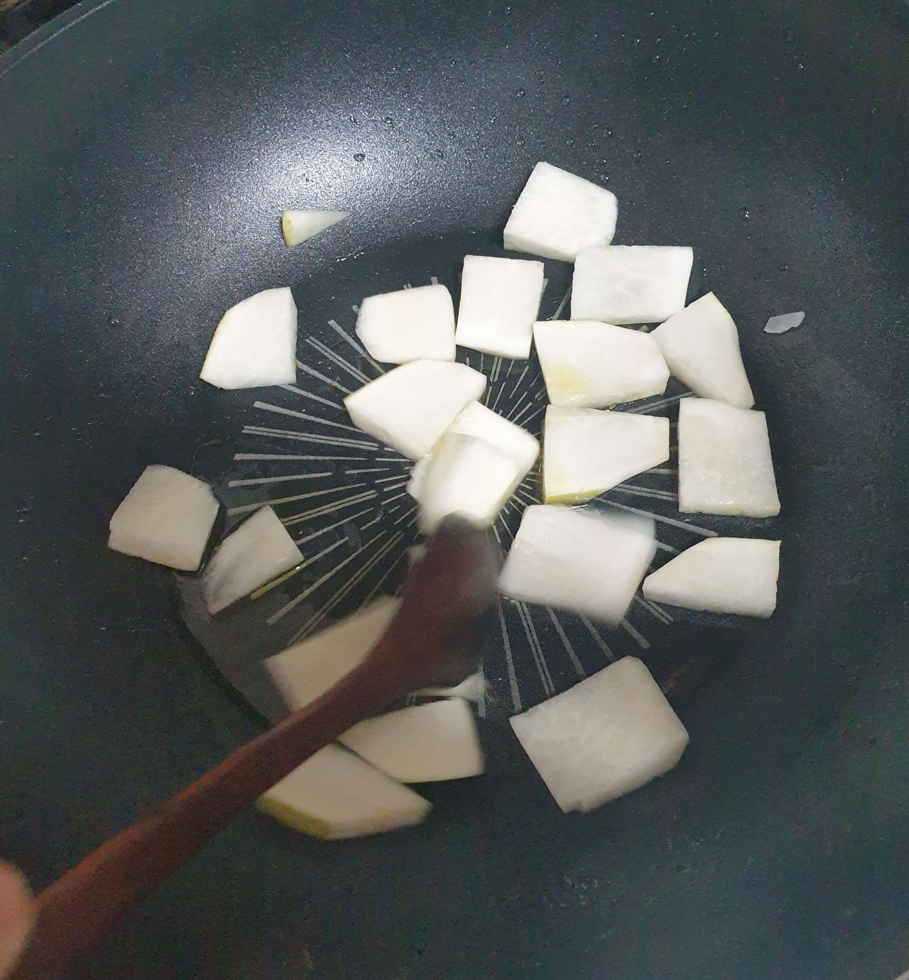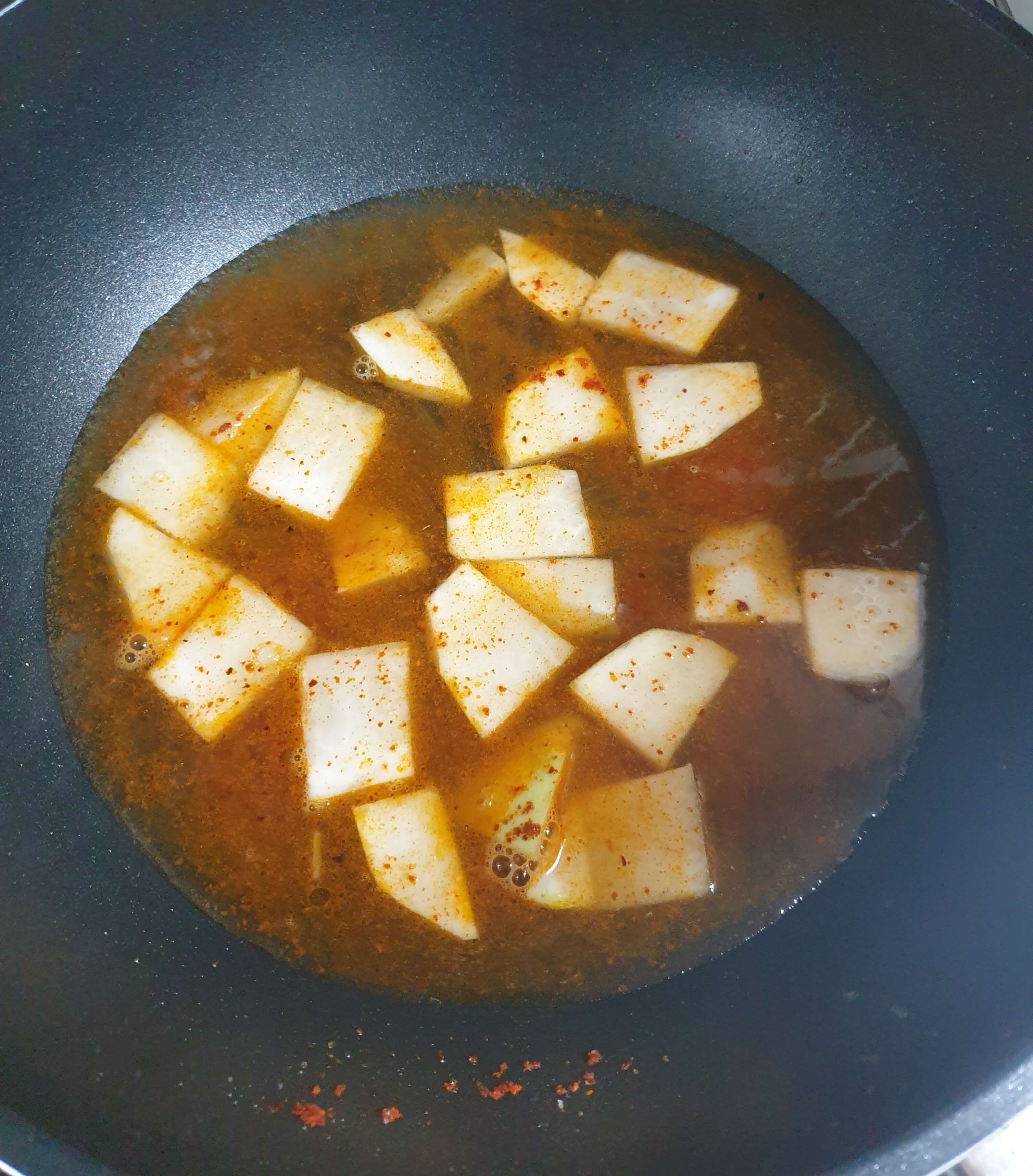 물이 팔팔 끓고 무가 어느 정도 익었으면