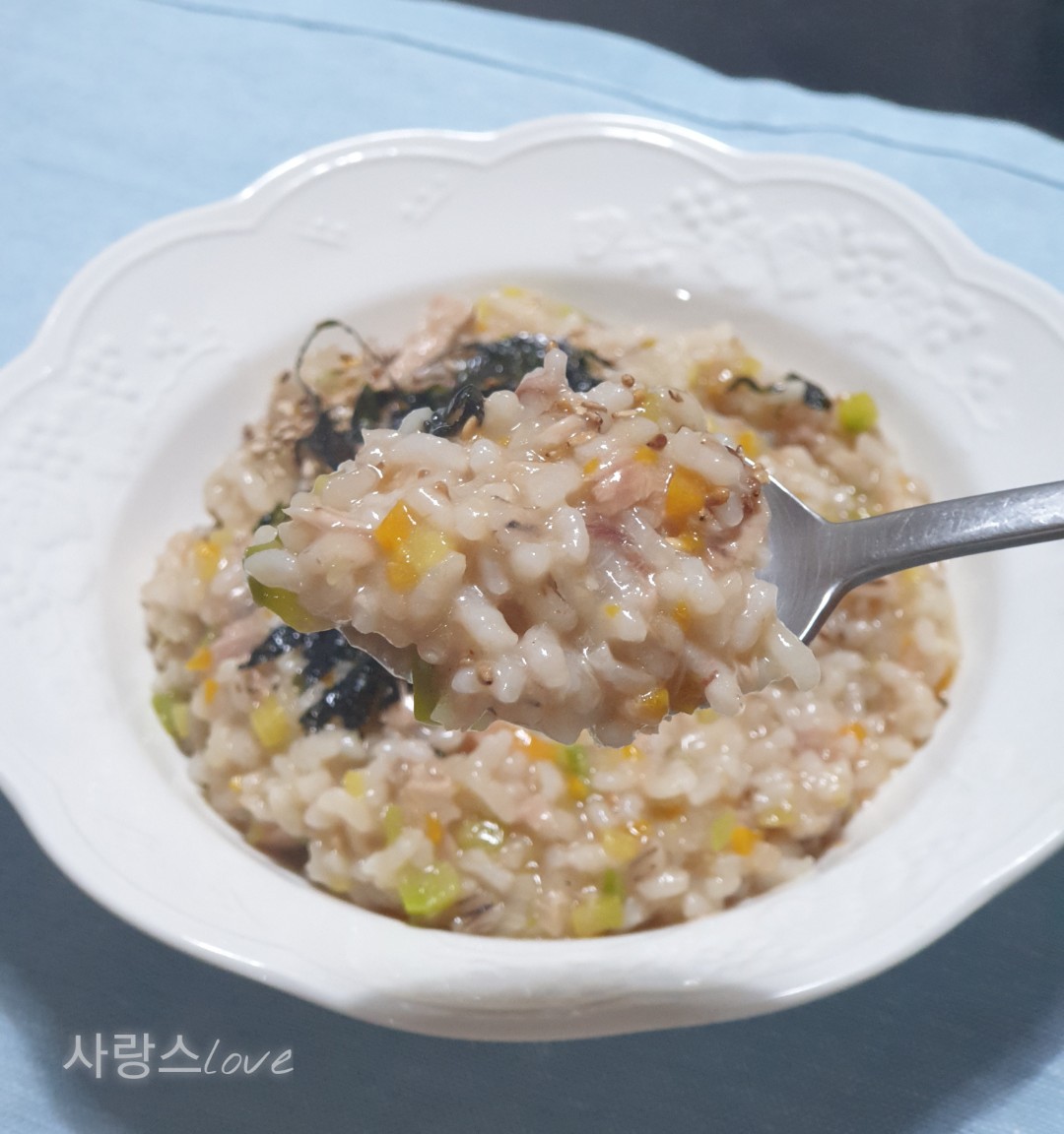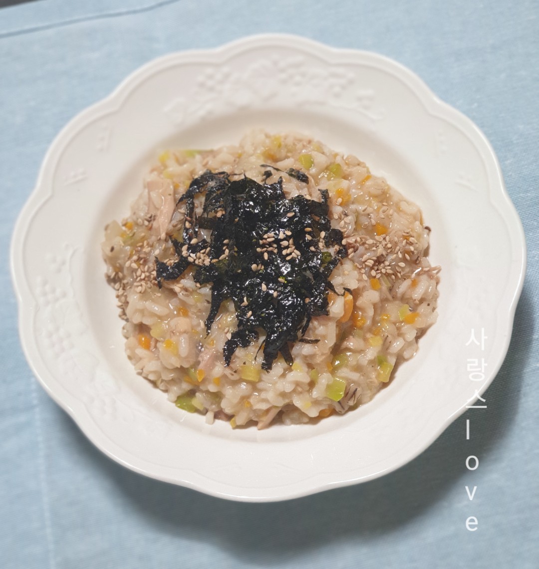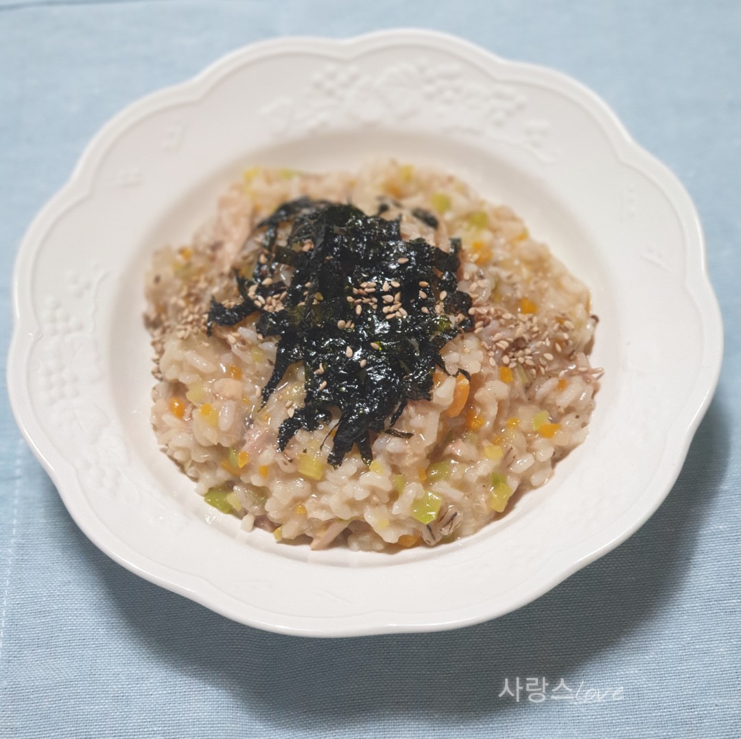 김가루와 통깨까지 뿌려 더 맛있는 야채 참치죽이에요.