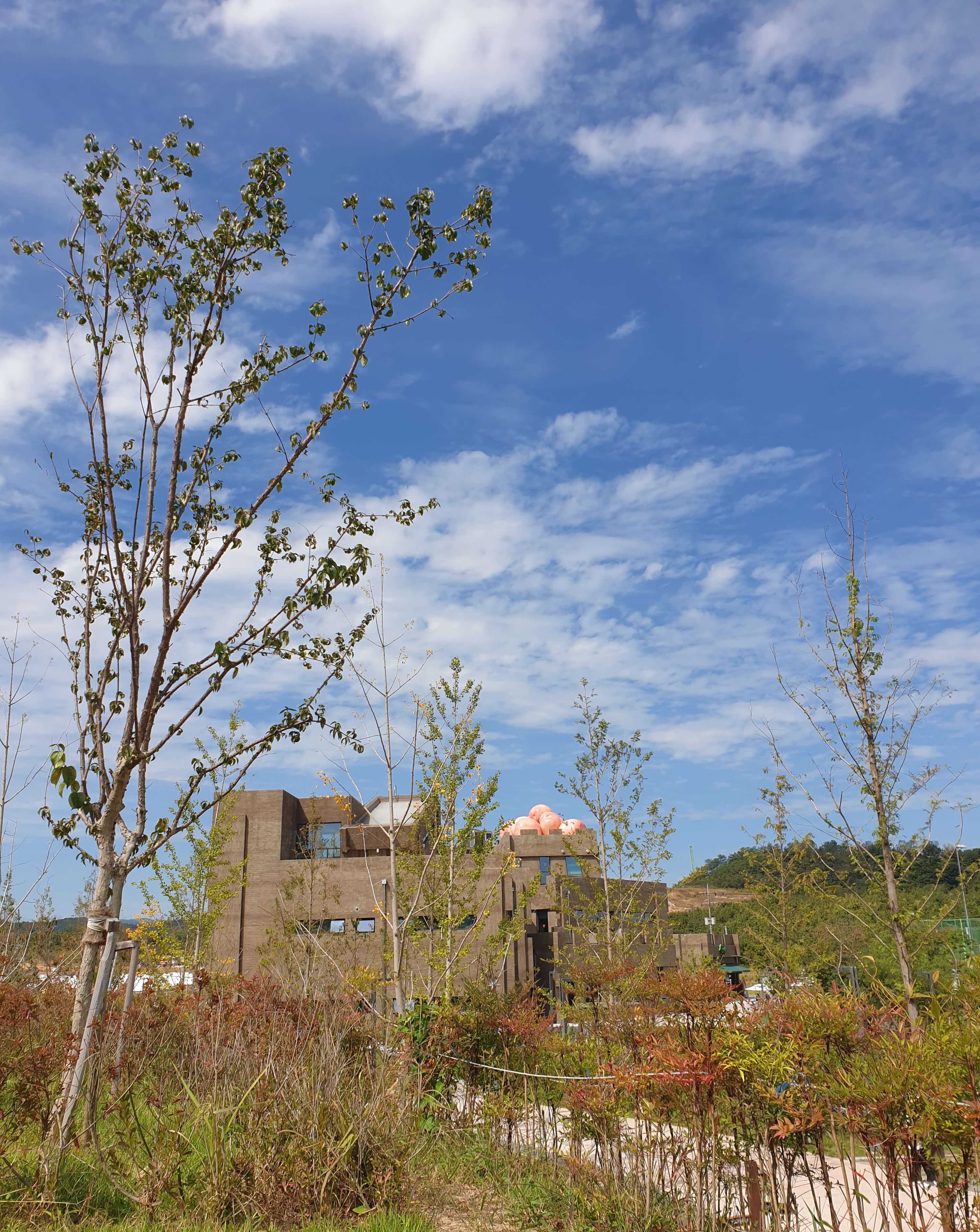 건물 위에 깨알같이 보이는 복숭아 모형 ㅎㅎ