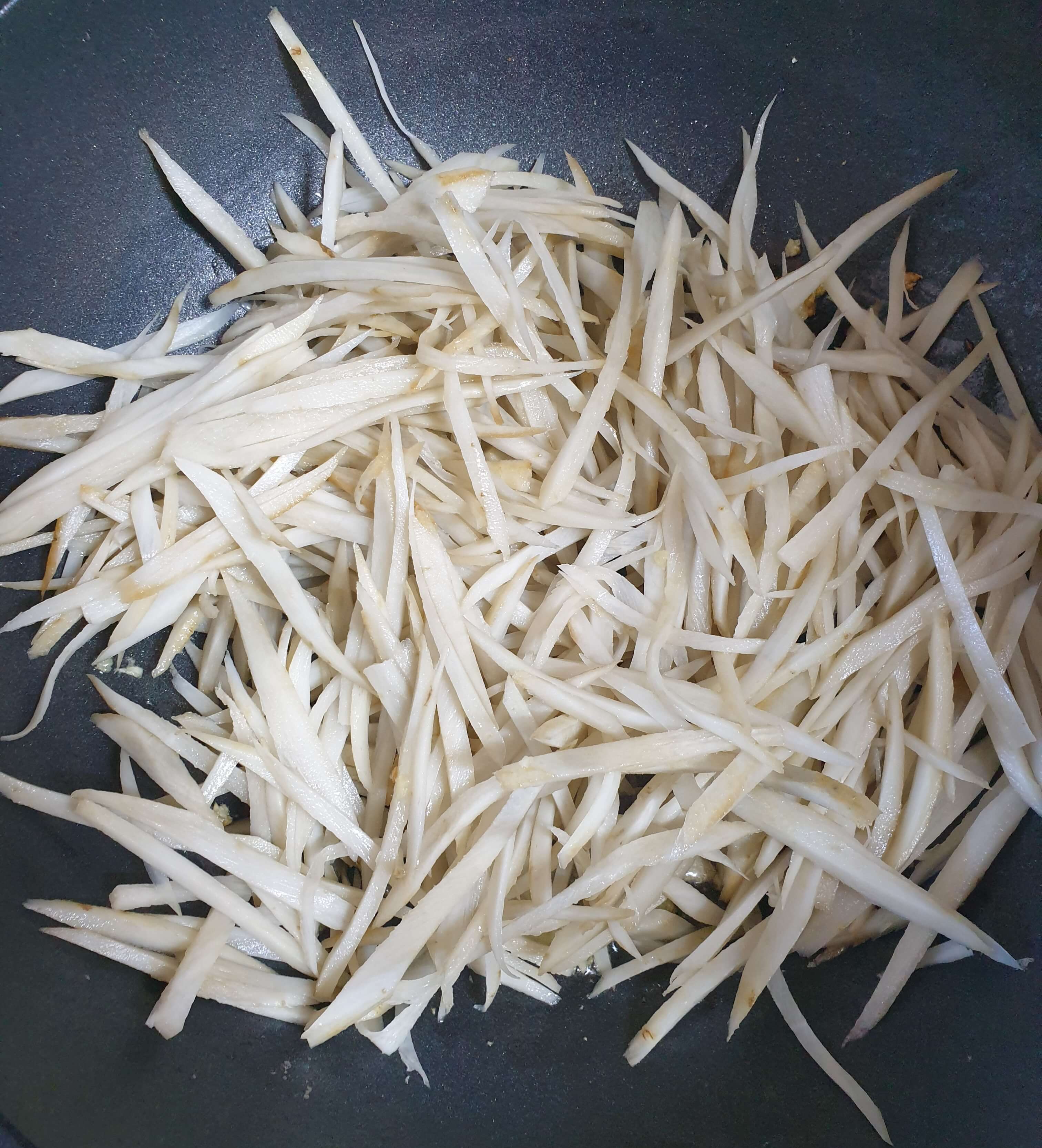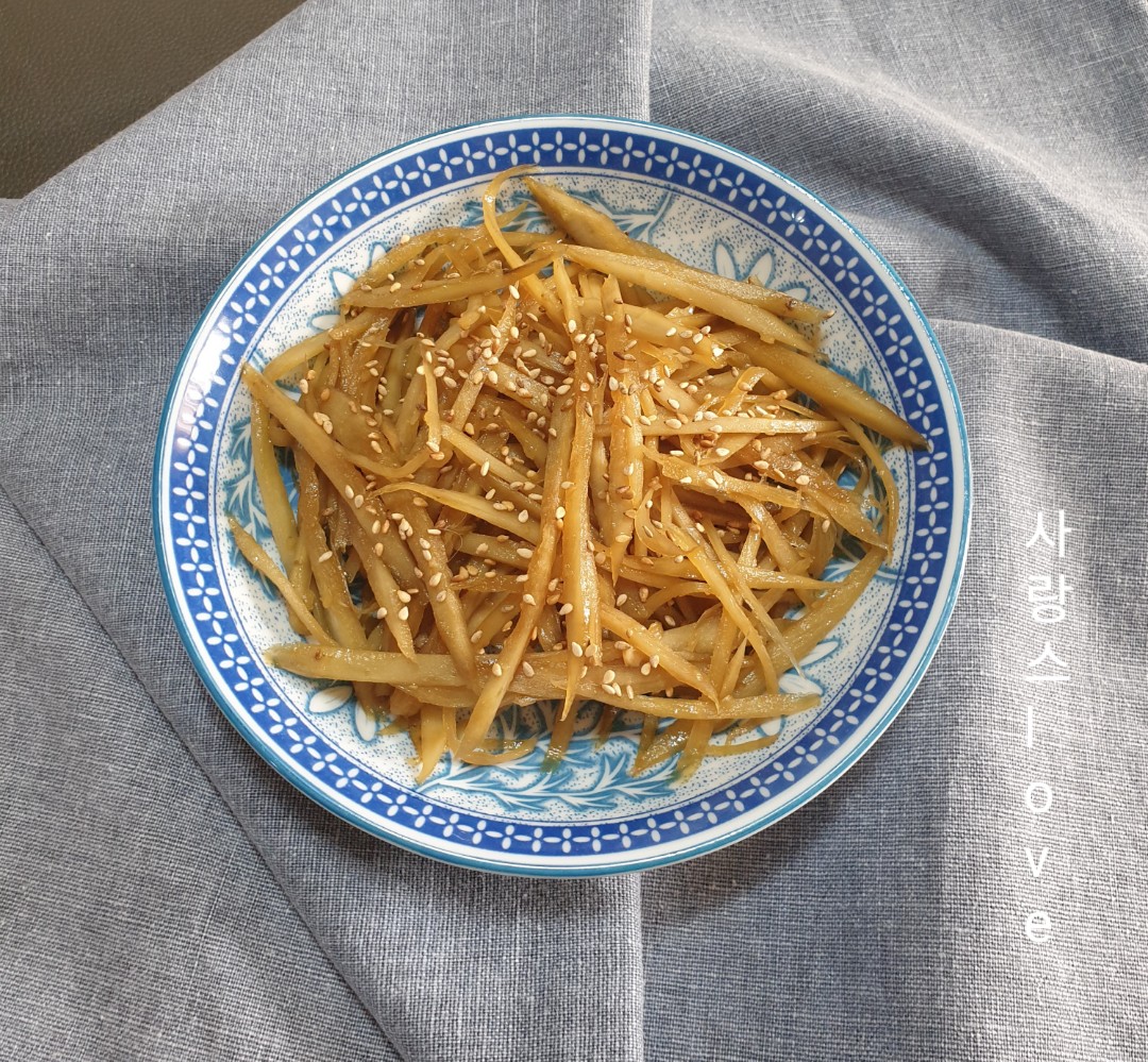 우엉채를 넣고 기름이 잘 묻도록 볶아줍니다.