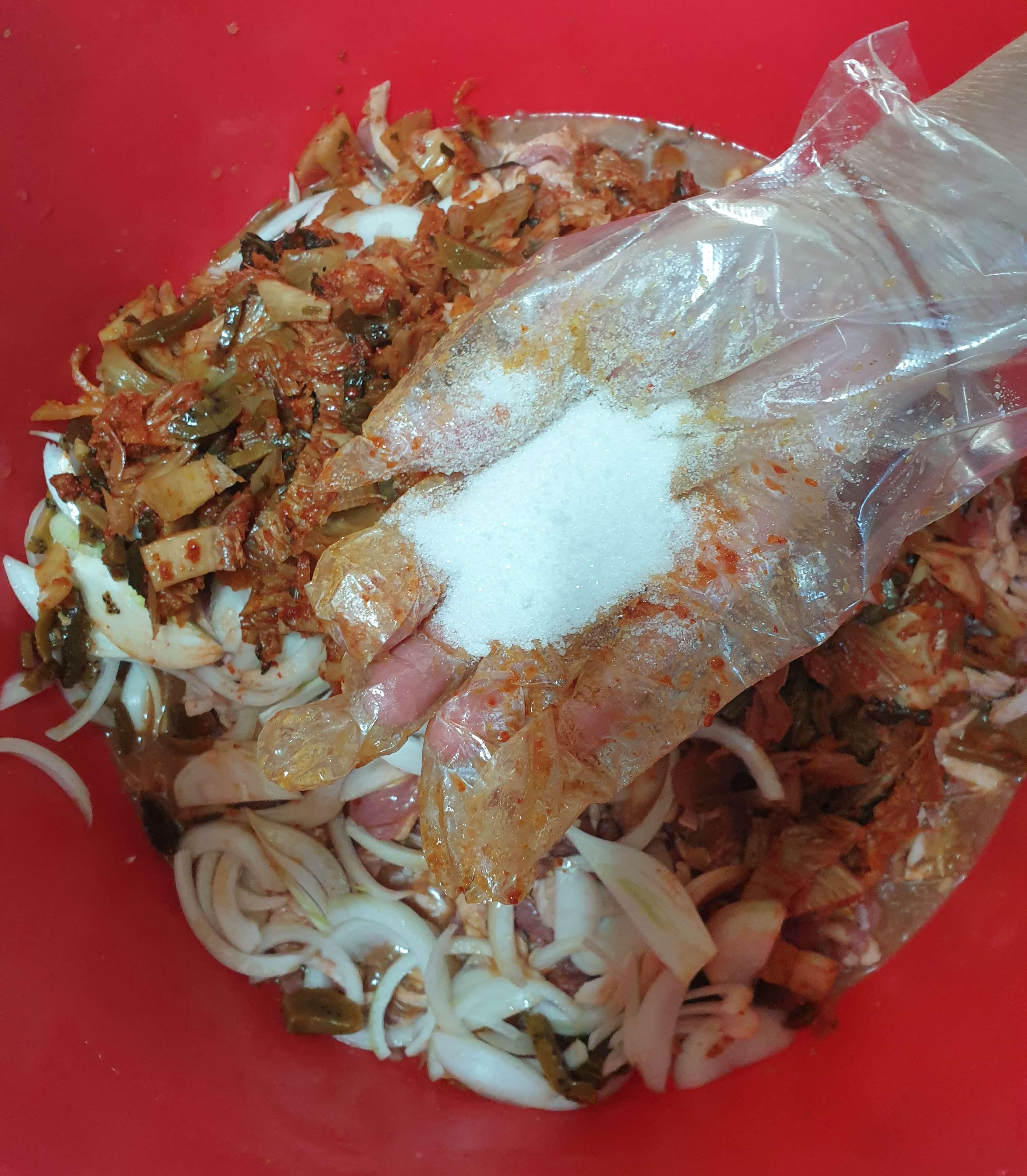 설탕은 약 두 주먹을 넣고 잘 버무려 주세요.