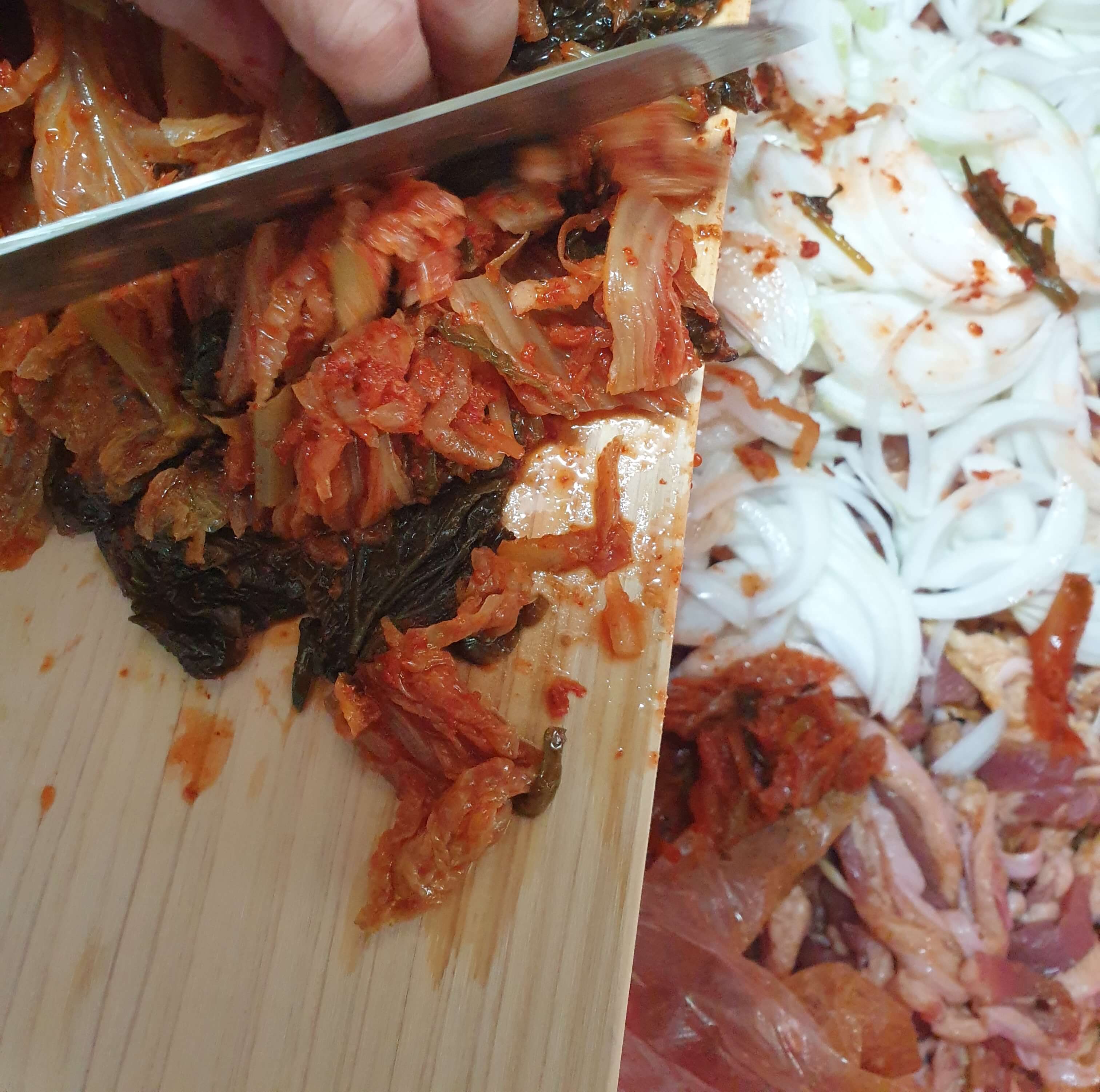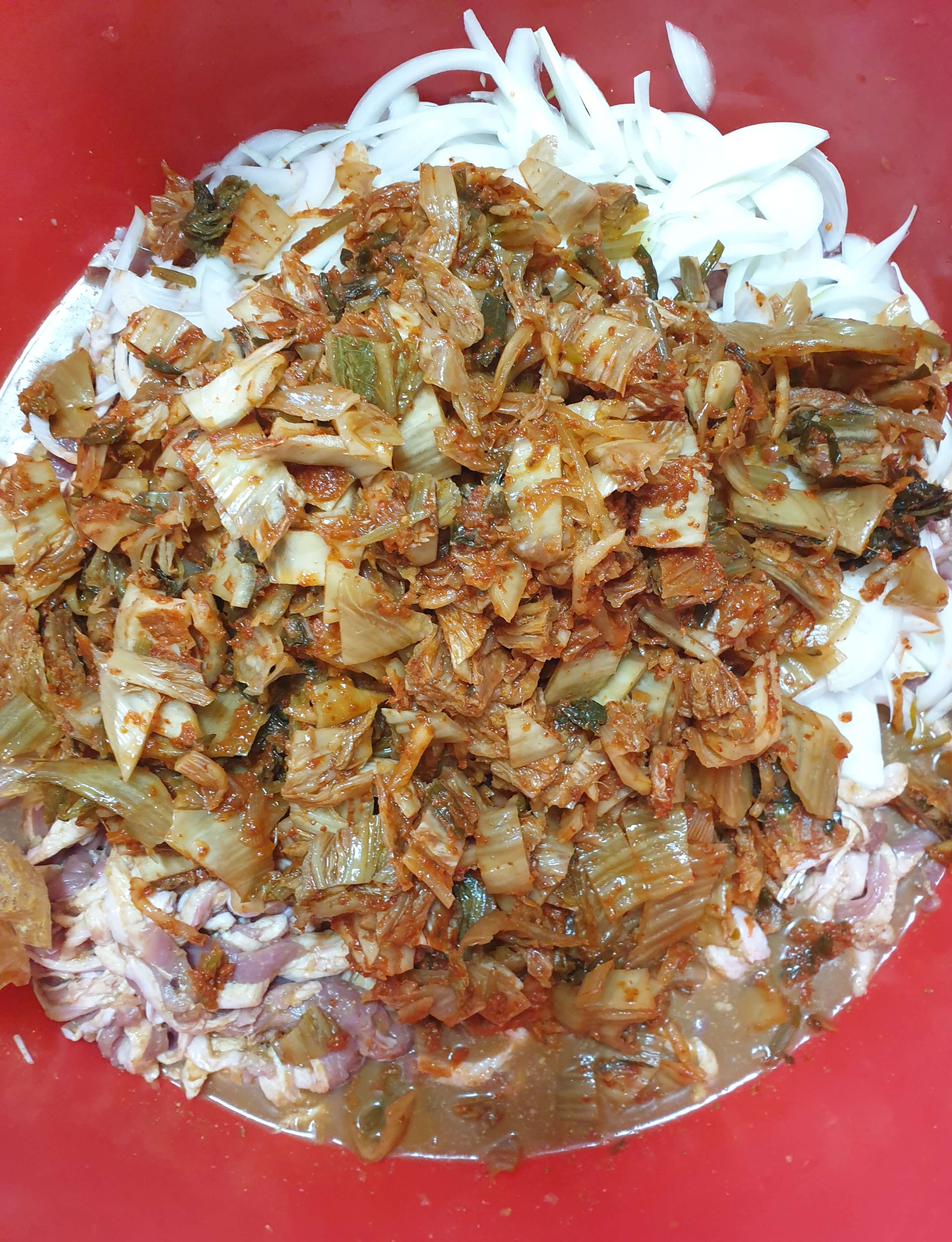 김치 2/3통을 먹기 좋게 썰어 넣어주세요.