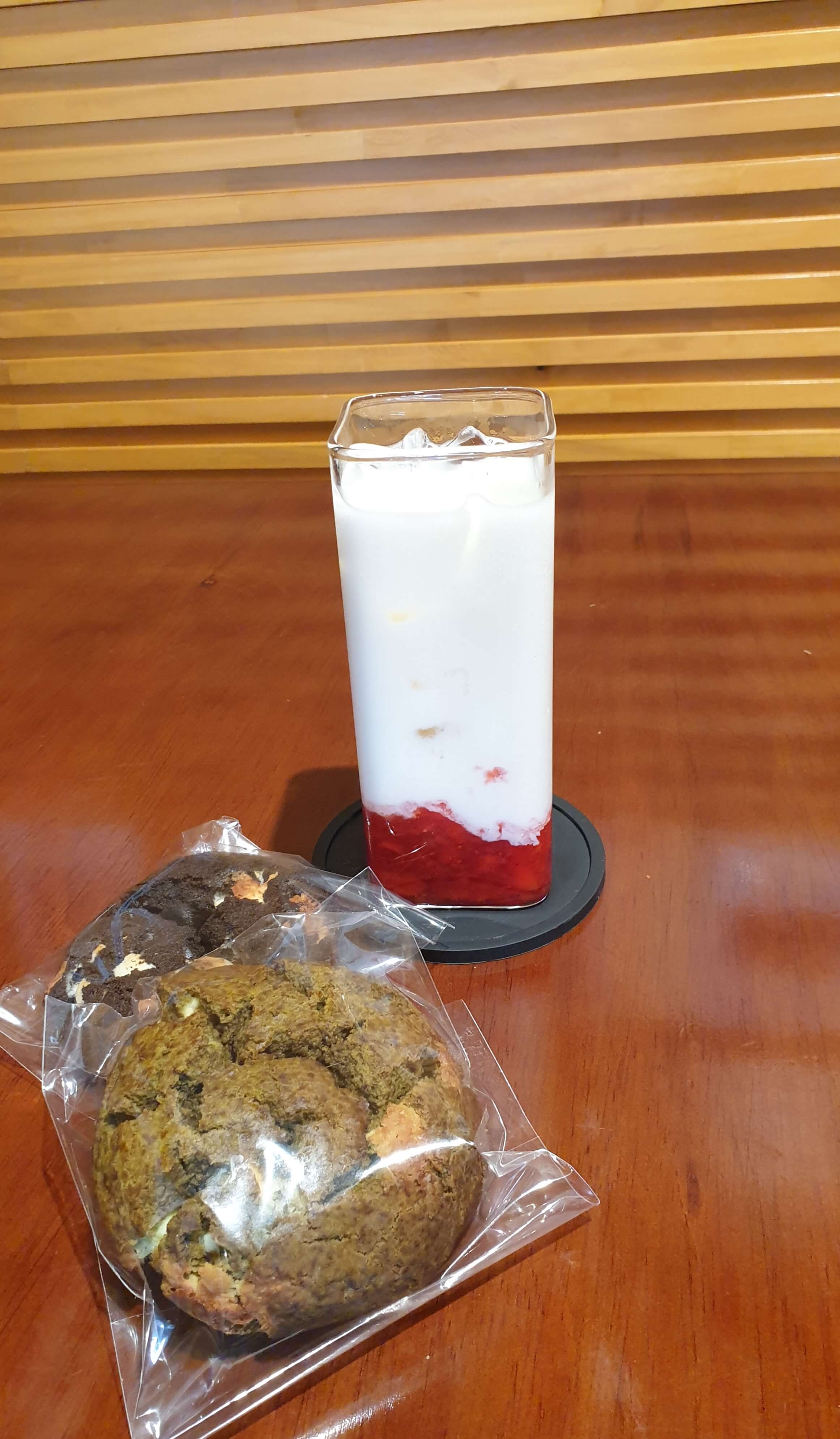 르뱅 쿠키와 3명이 시킨 딸기라떼.