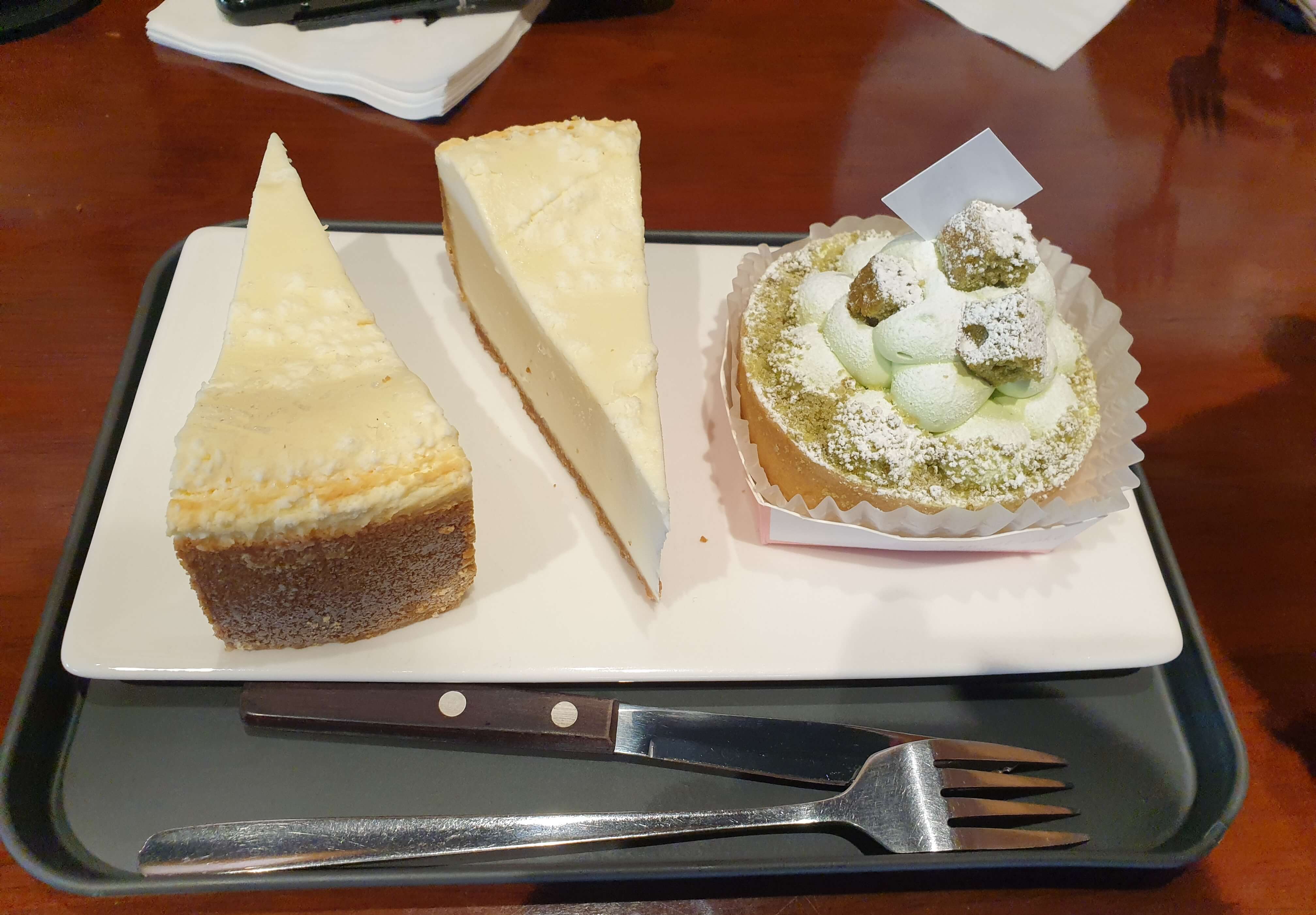 다른 치즈케이크는 다 솔드아웃이라 시킨 플레인 치즈케이크와 말차 몽블랑.