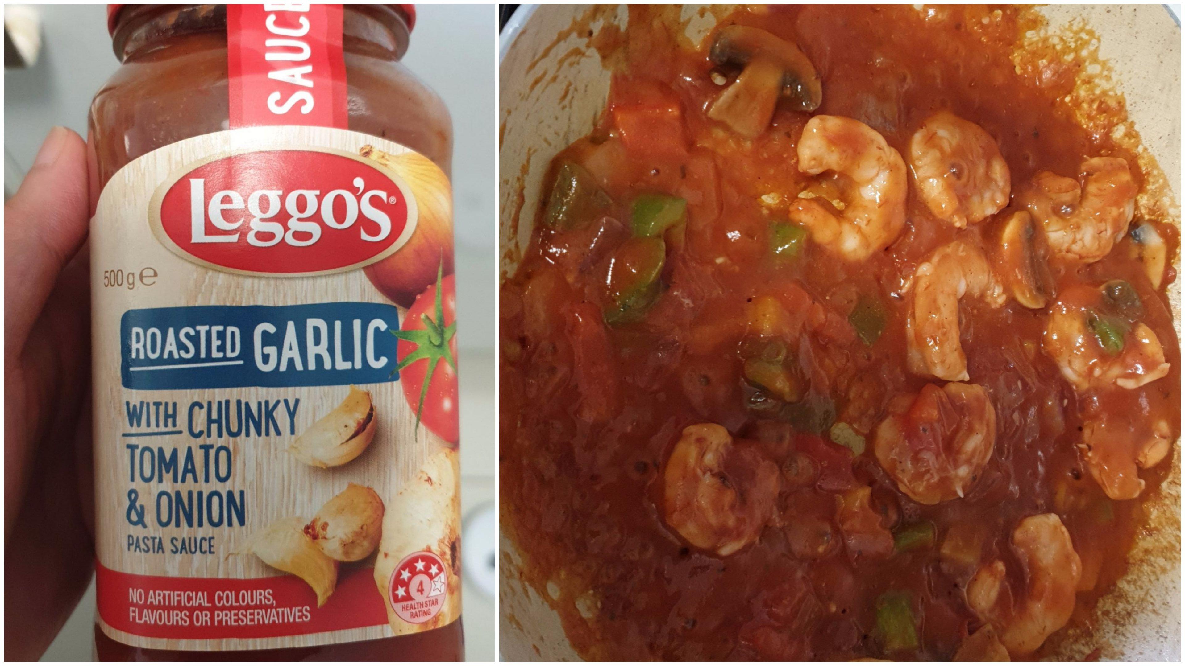 야채와 새우가 다 익어 갈 때쯤 시판 소스를 반 정도 넣고