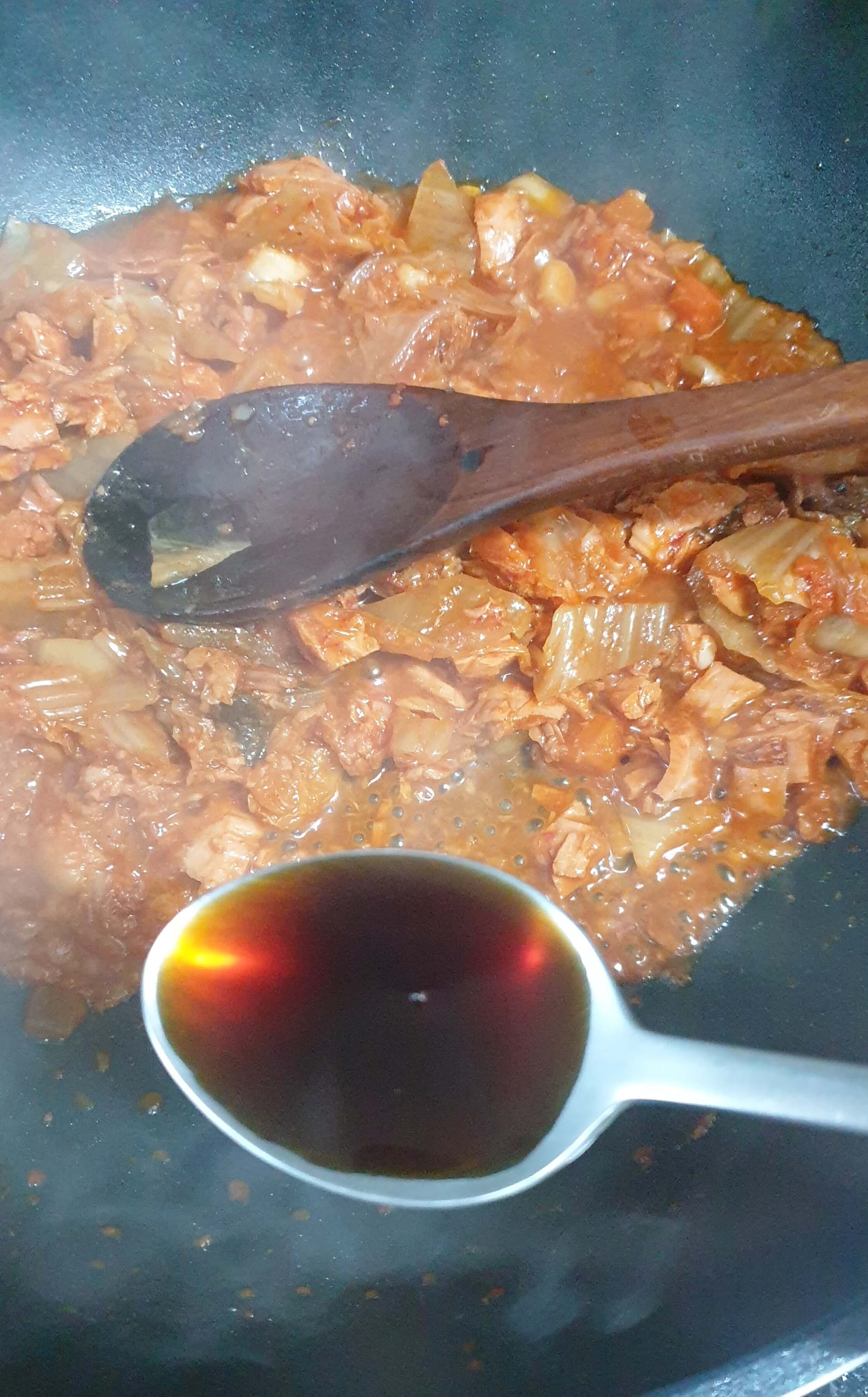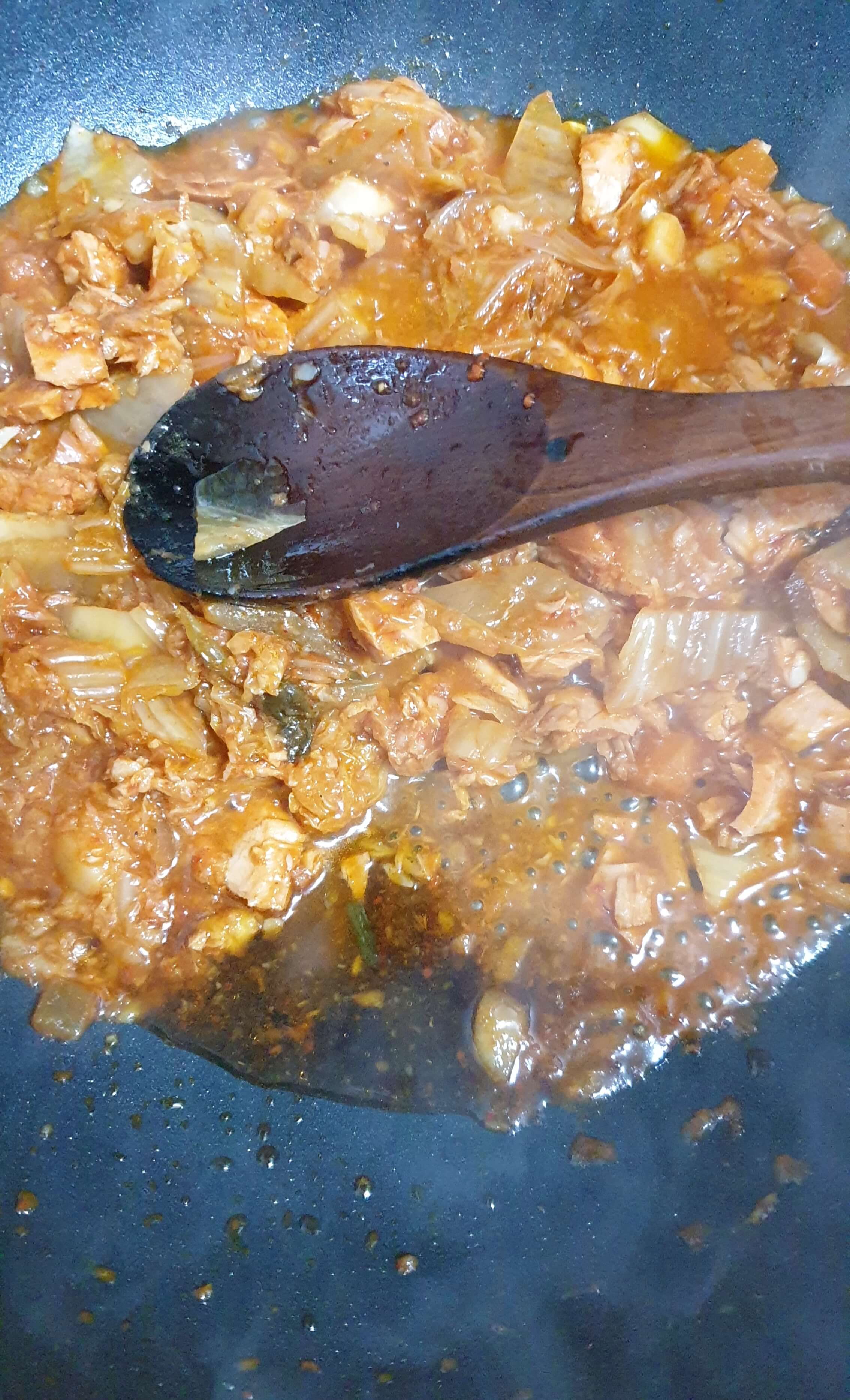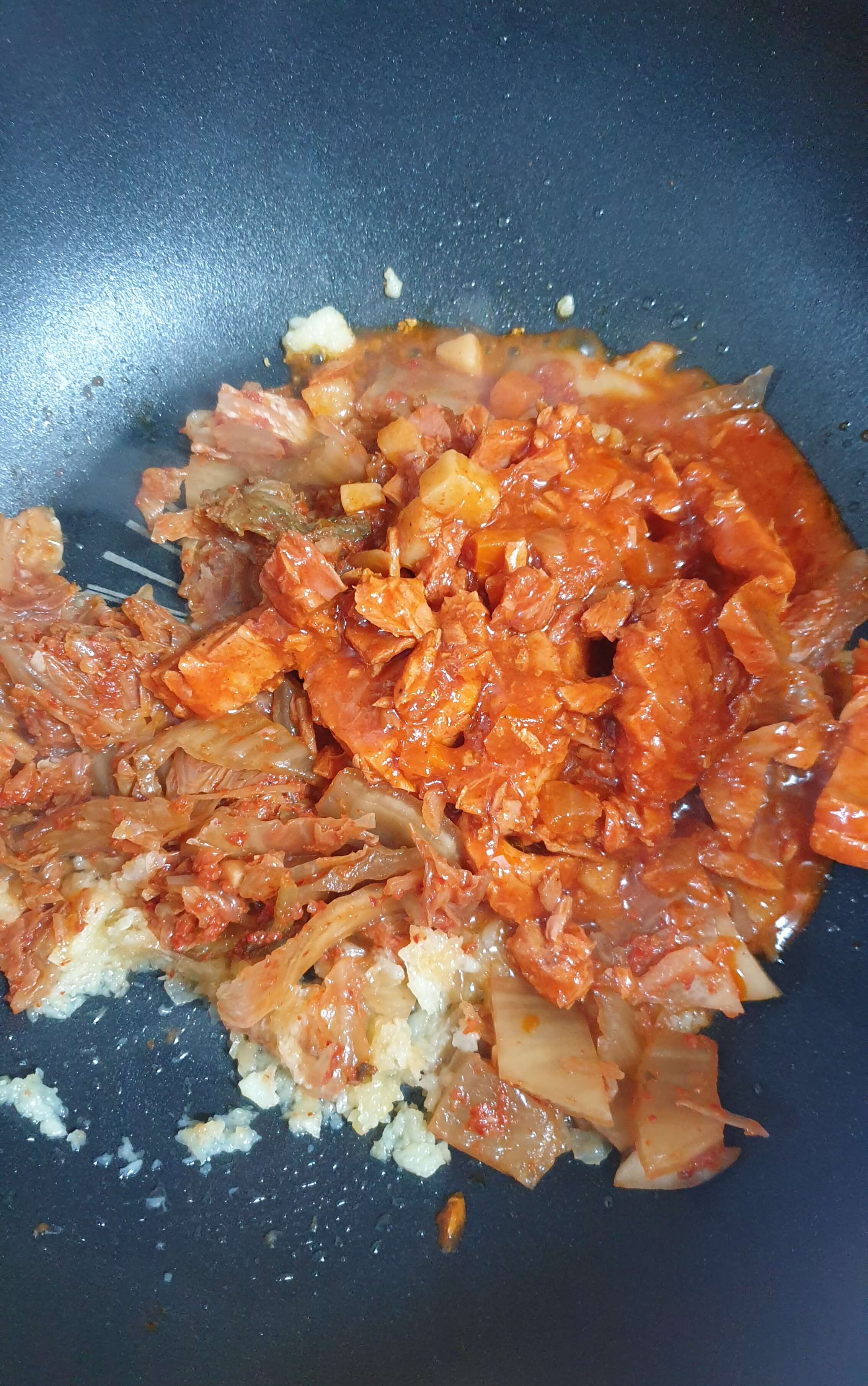 썰어놓은 김치와 고추참치 2캔을 넣고