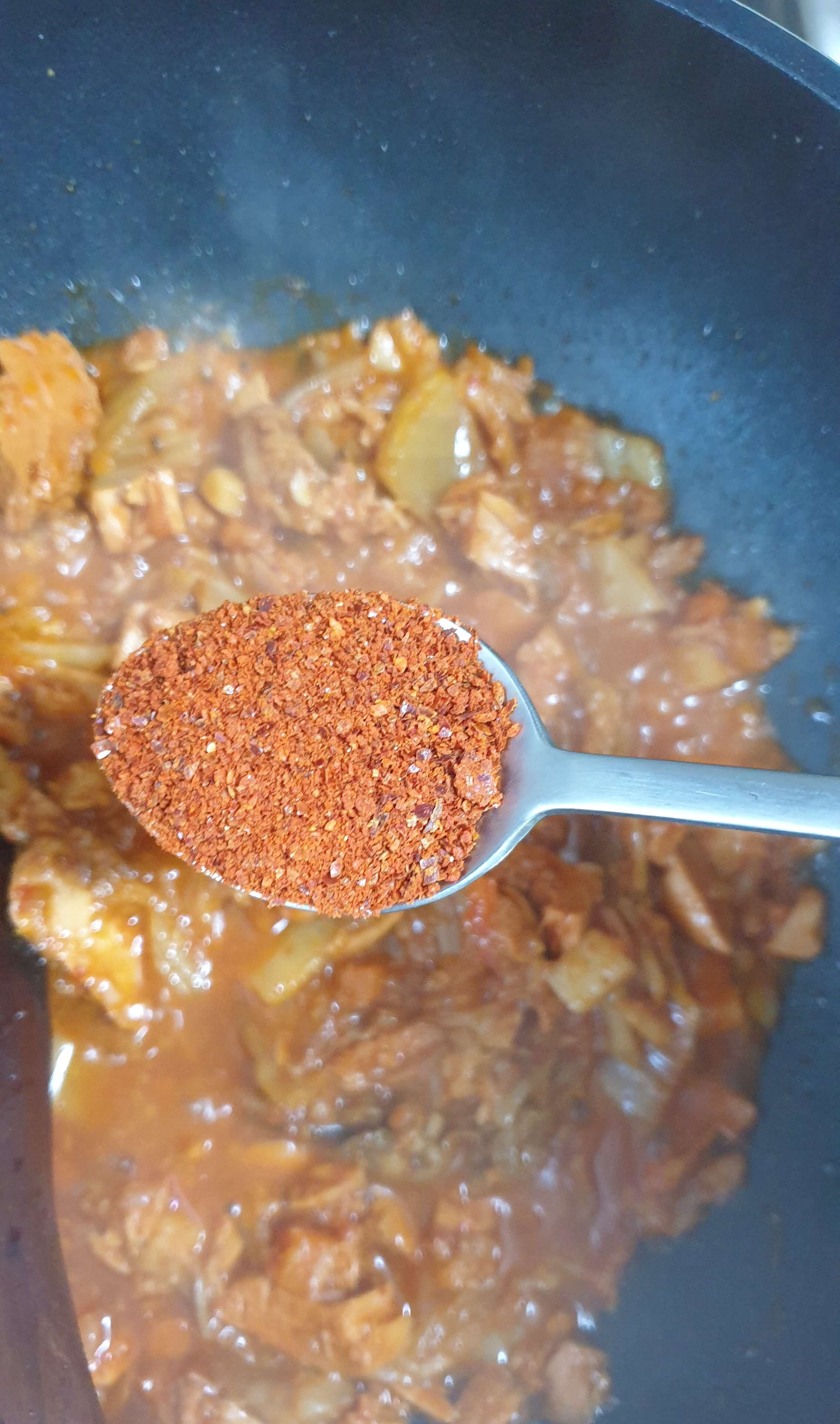 고춧가루 1큰술을 넣고 잘 볶아주세요.