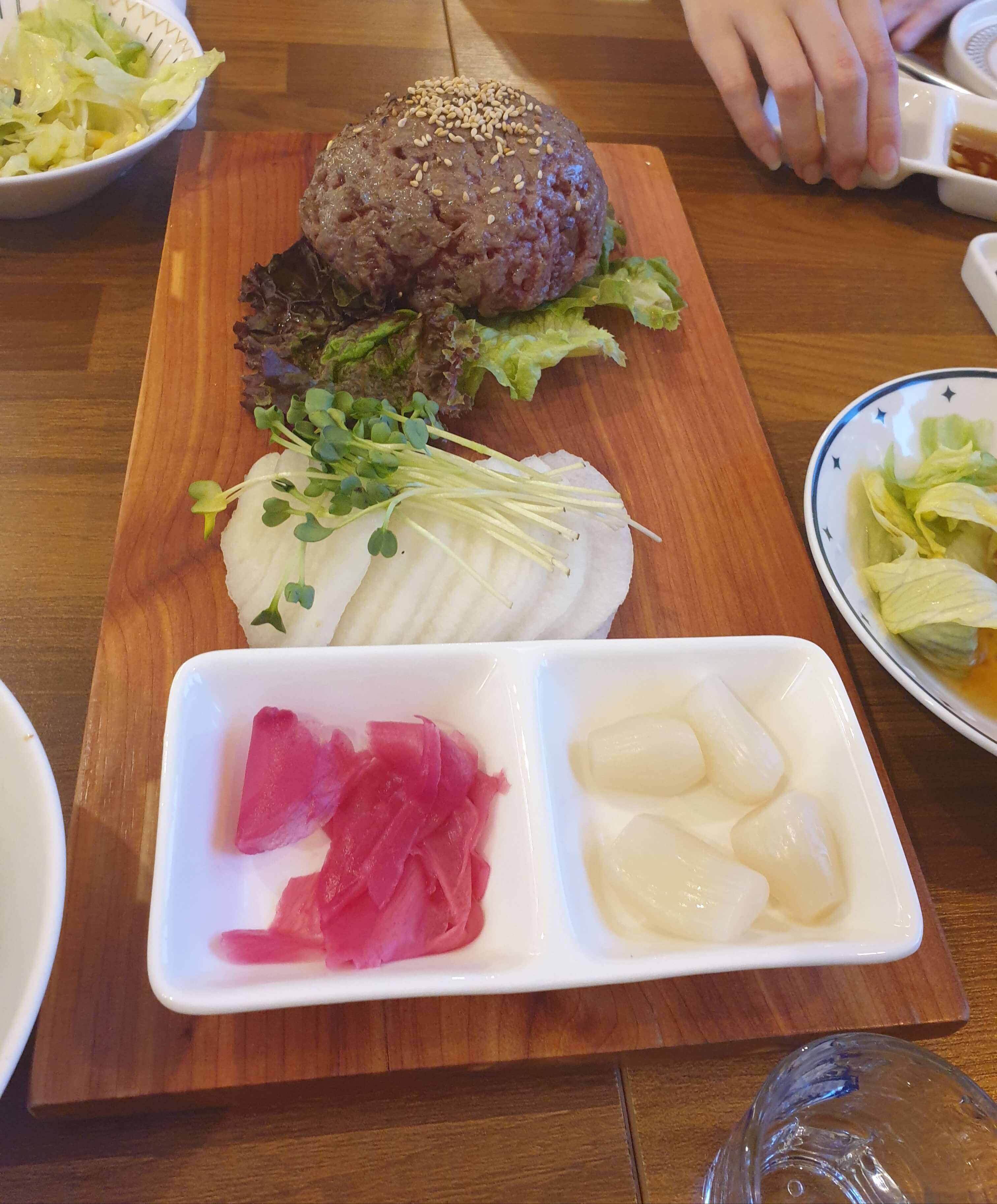 고기와 함께 장아찌, 샐러드, 겉절이, 핑크 솔트, 홀그레인 머스터드, 와사비, 레몬 버터가 나왔다.