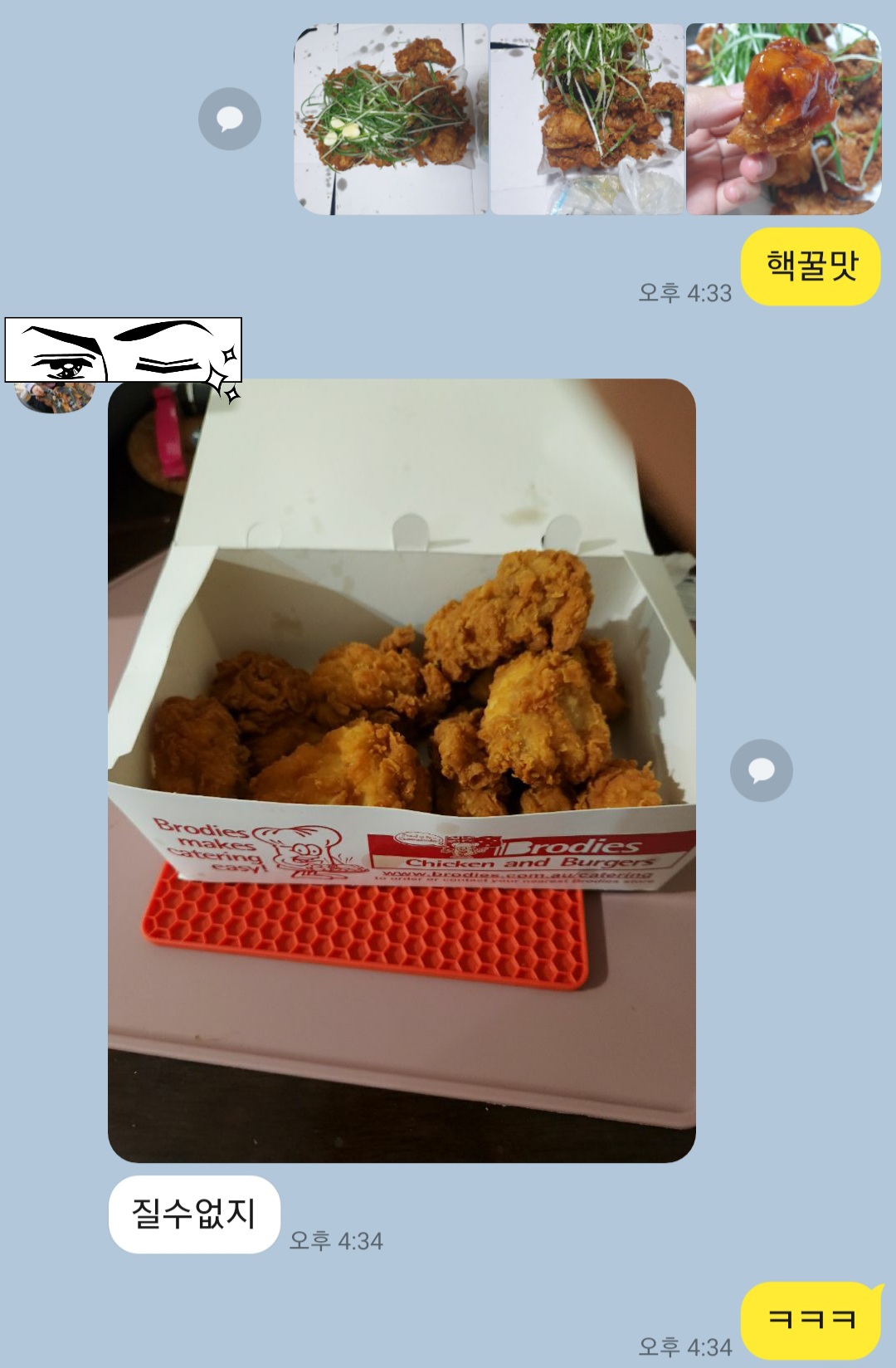 남편이 조치원 파닭을 좋아해서 톡으로 놀렸는데 맛은 다르지만 남편도 치킨 먹고 있는 중이었다ㅋㅋ