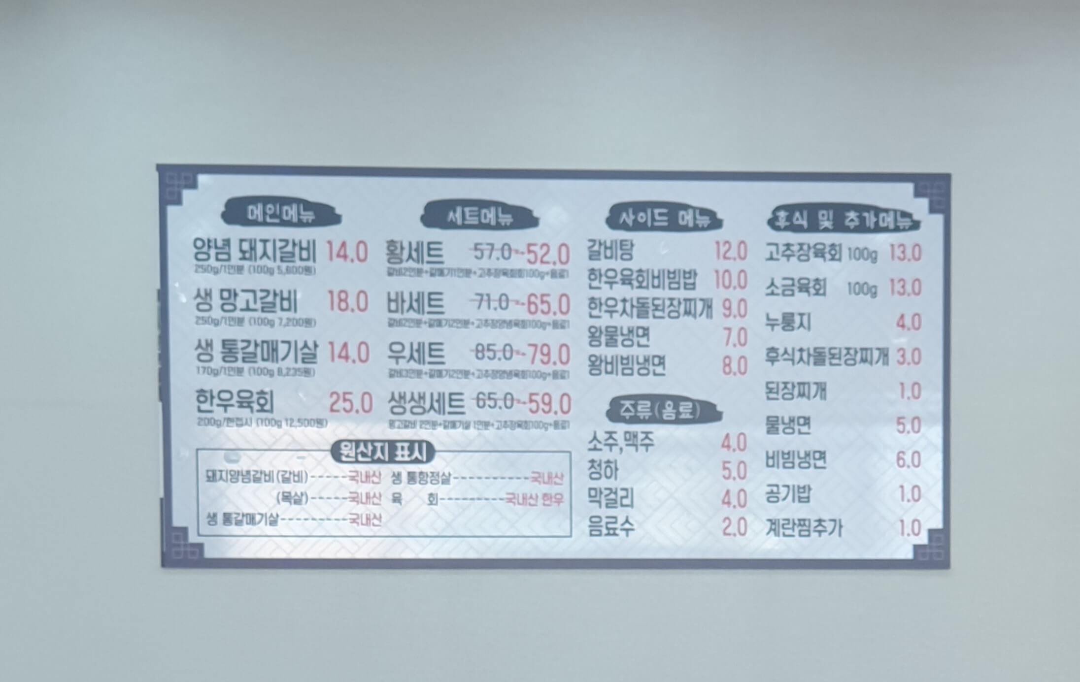 양념 돼지갈비가 먹고 싶었지만 아버지가 당이 있으셔서 예전에는 없었던 메뉴인 생 망고 갈비를 시켜보기로 했다.