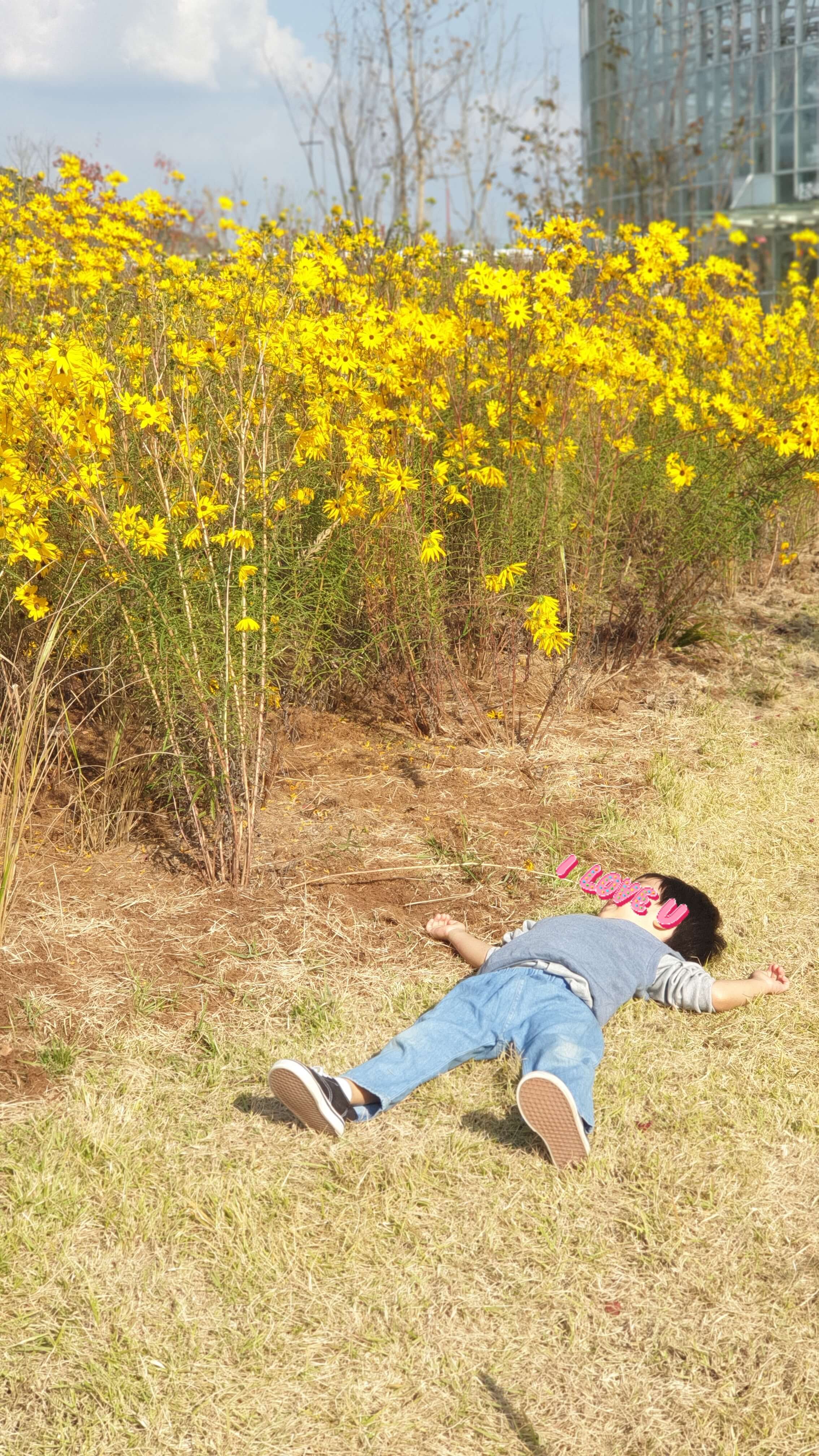 노란 꽃들이 예뻐서 꽃들이랑 같이 찍자 하니 발라당 누워버리는 아들.