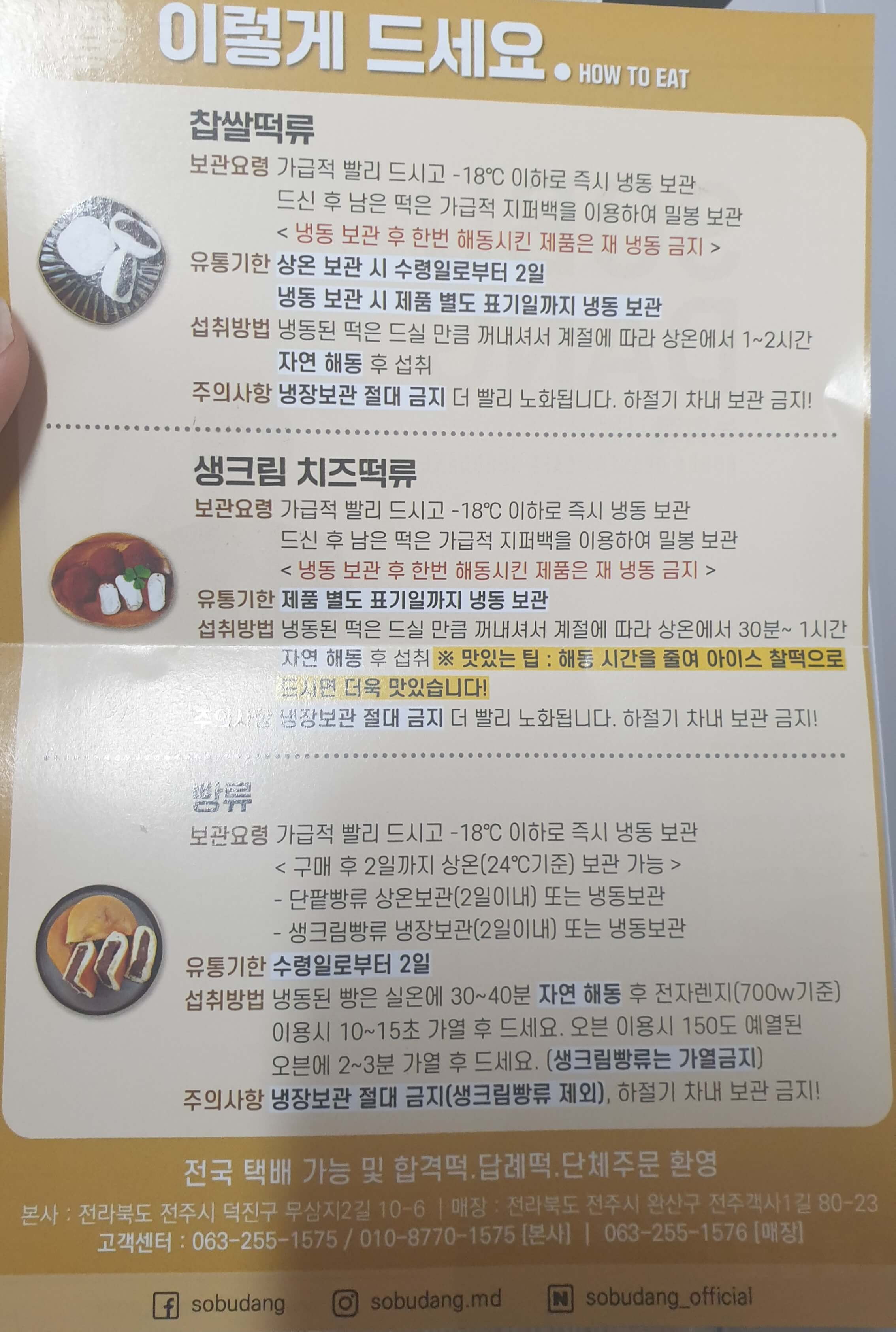 찹쌀 떡류, 생크림 치즈 떡류, 빵류 보관 요령이 자세히 나와있다.