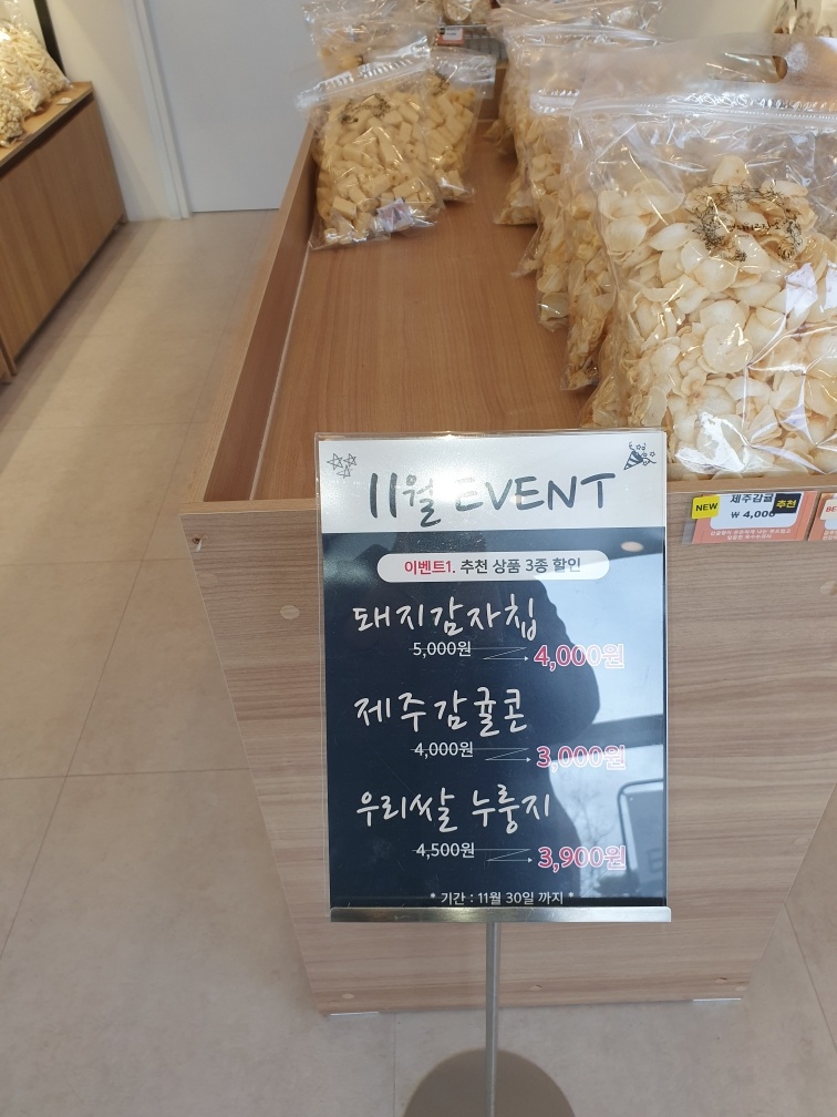 매달 할인해주는 제품도 있나 본데 11월 할인 제품에는 돼지감자칩, 제주감귤콘, 우리 쌀 누룽지가 있었다.