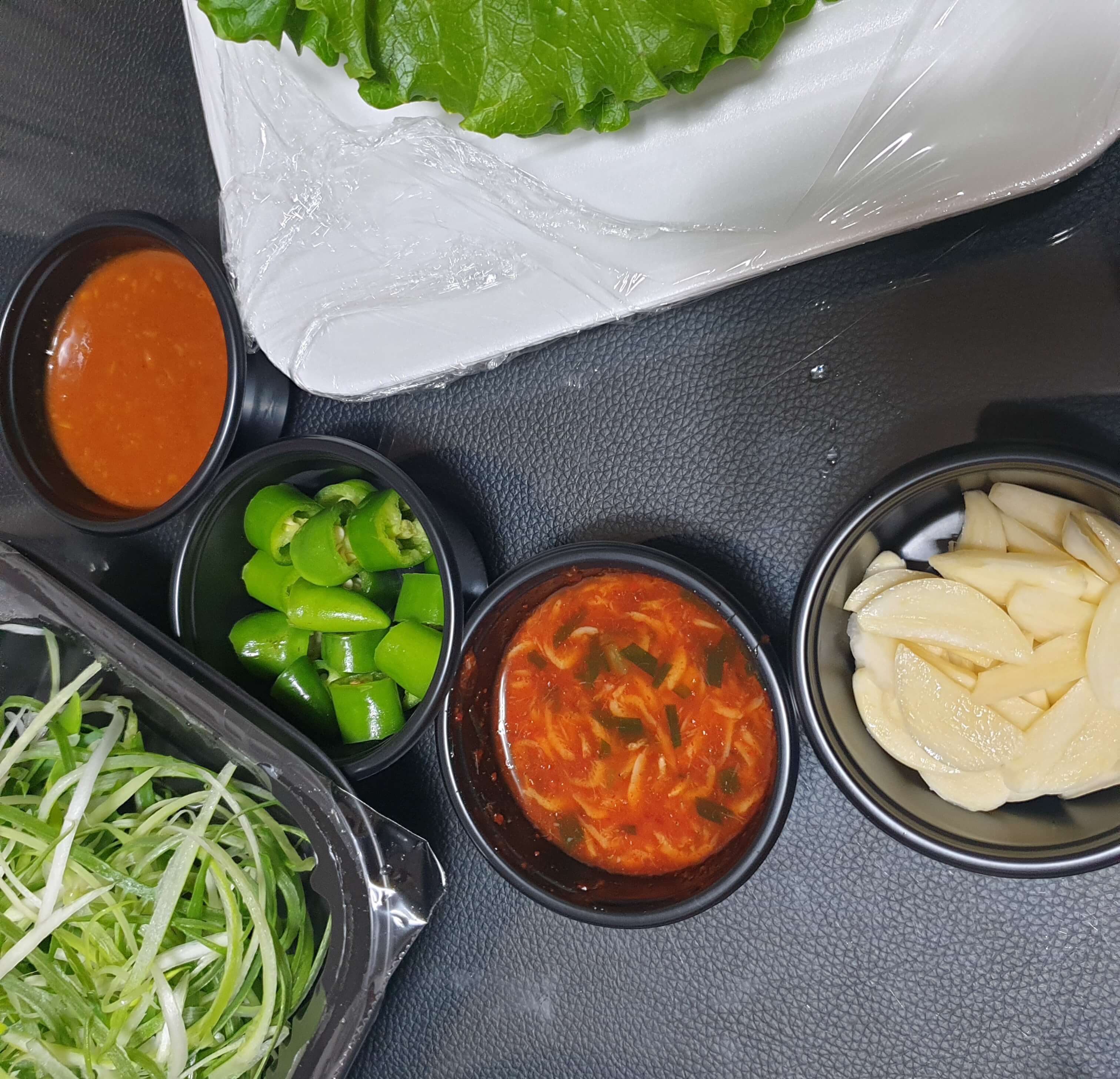 신선한 상추와 마늘, 고추, 찍어먹을 것들