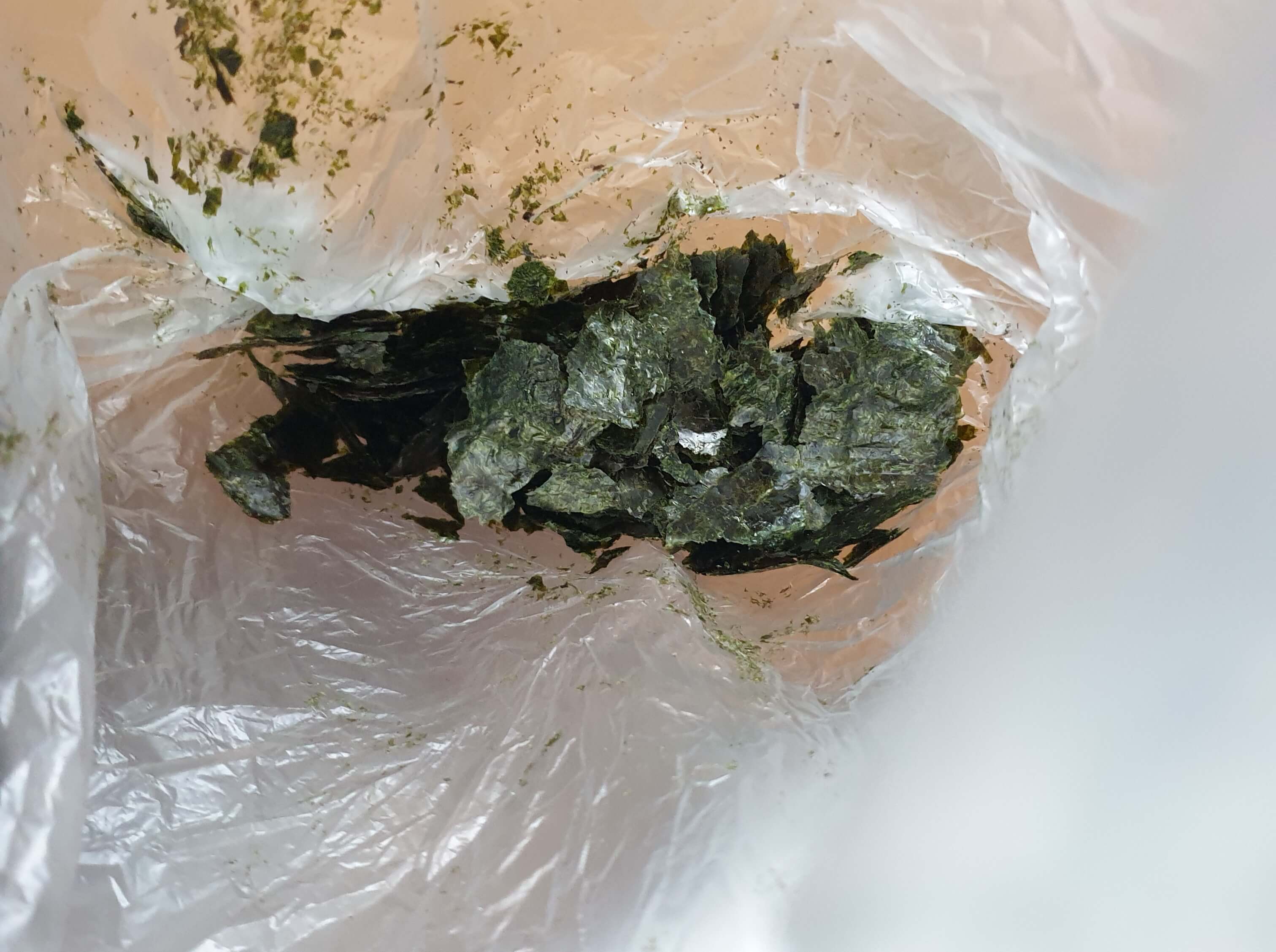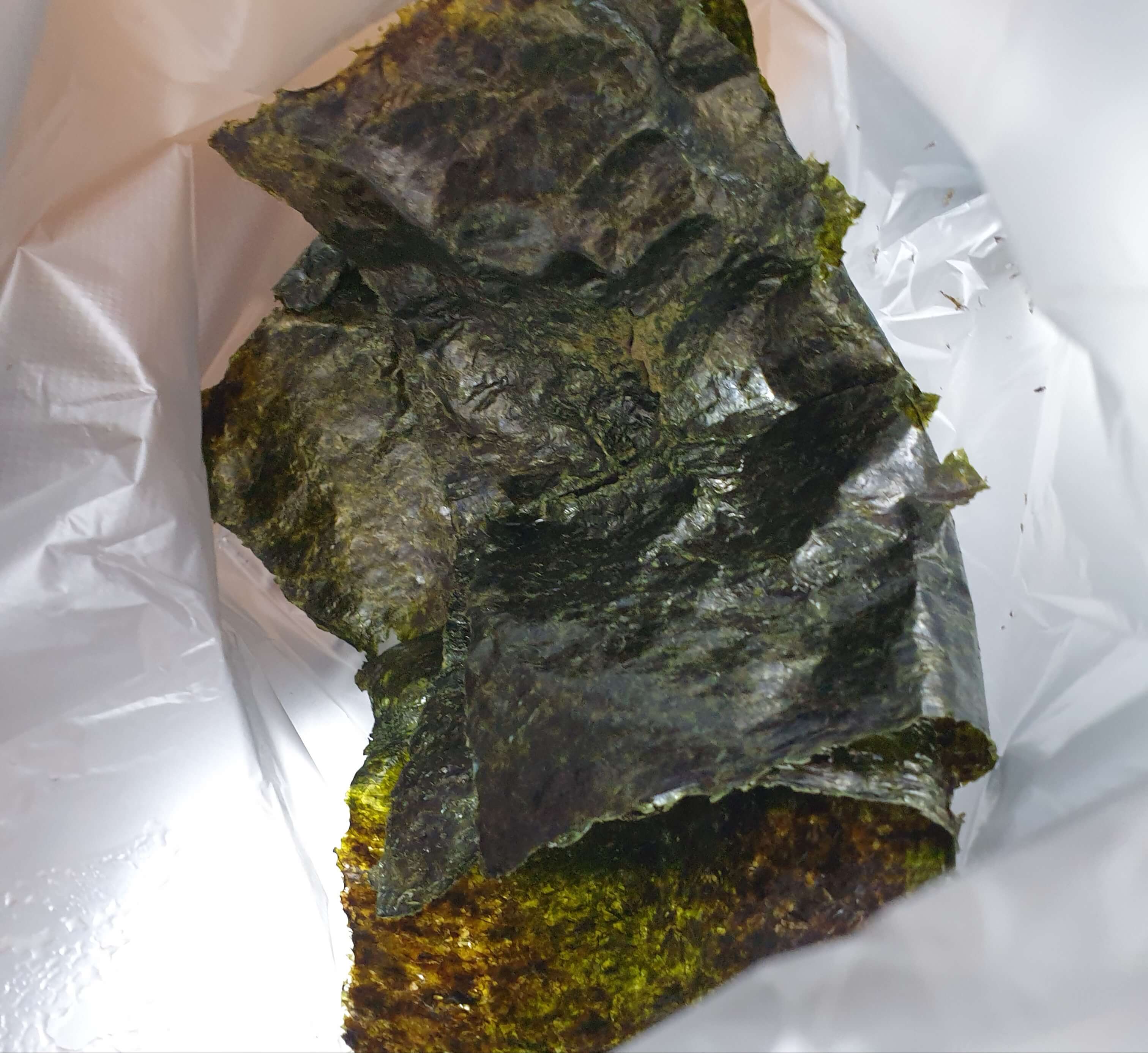 생김을 2장 구워 비닐에 넣고 부셔 줍니다.