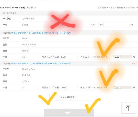 용량, 수량, 개당 신고가격 적어주고